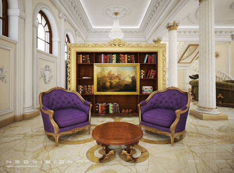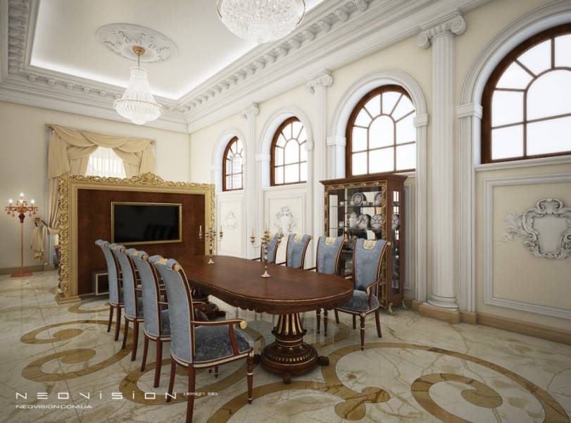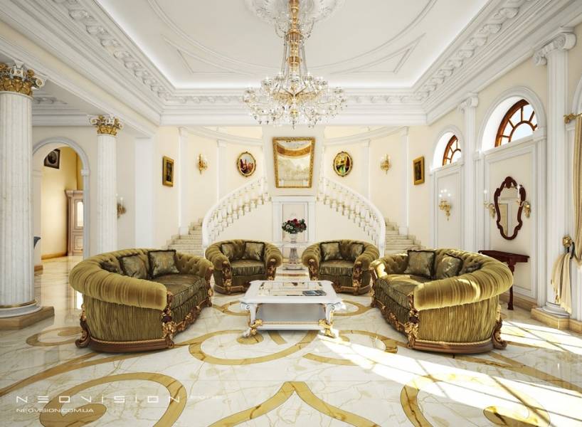 В основу концепции интерьера этого дома заложена идея создания частной резиденции, которая выражает величие,высокий общественный статус хозяев и служит для приема, комфортной жизни и хранения материальных и духовных ценностей семьи. Дом имеет огромное пространство холла и большие комнаты, что подчеркивает шик и престиж интерьера. Высокие потолки выражают величие и раскрепощают душу, а большая роскошная лестница с двумя рукавами дает ощущение стабильности и объединяет все три уровня дома. Большинство элементов стиля перекликаются с историческими образцами классических и барочных интерьеров. Этот интерьер призван стать одним из последних величественных образцов классической архитектуры.