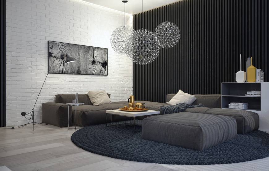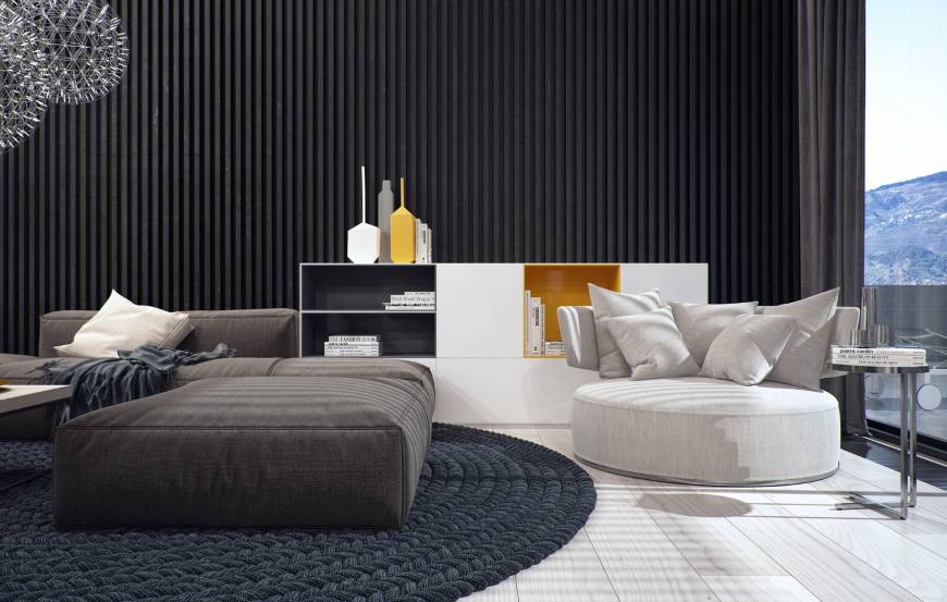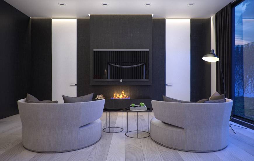 Стиль, в котором выполнен этот дом в Крыму сдержанный, "немногословный". Но при этом атмосфера в пространстве очень уютная. В каждом помещении есть детали, которые обращают на себя внимание. В столовой интересна вертикальная зеленая стена с разными видами растений. А также золотая люстра-волна. В гостиной примечательна полка-дровница. Карликовое дерево в спальне создает особый уют.
