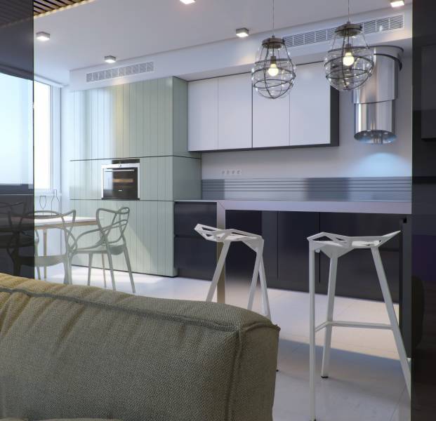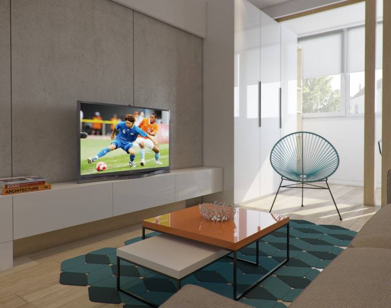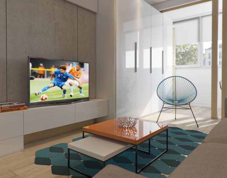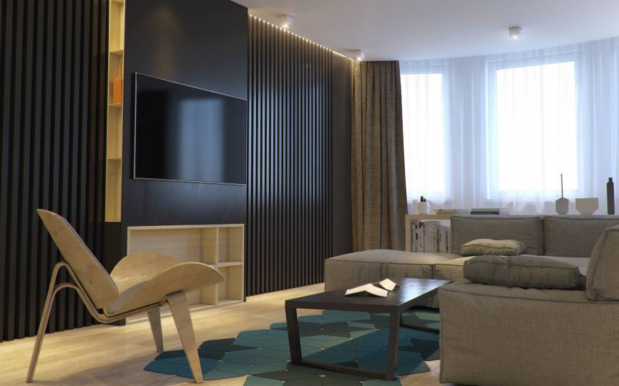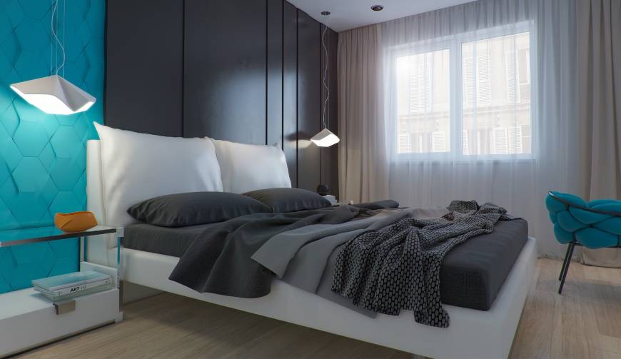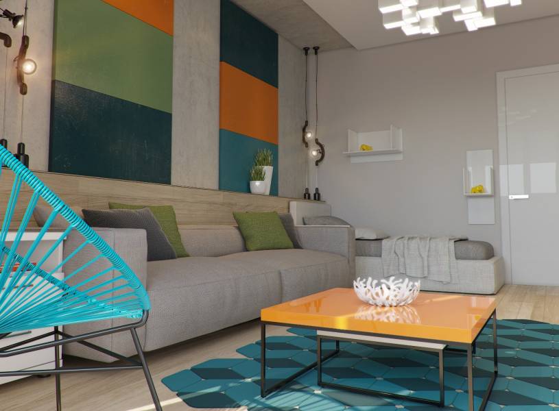 Хозяева этой квартиры площадью 75 кв. метра побоялись ярко оформлять весь дом. Но пестрых деталей им все-таки хотелось, поэтому они попросили добавить несколько акцентов в гостиной и спальне. В зоне отдыха за красочность отвечает стена, оформленная бирюзовыми 3D-панелями, а в гостиной притягивает взгляд апельсиновый журнальный стол и "поддерживающие" его цветные картины на стене.
