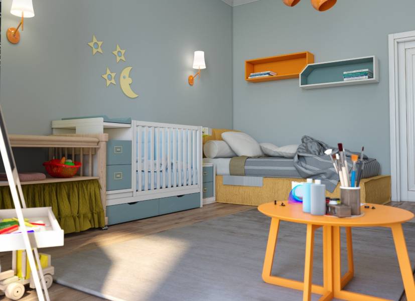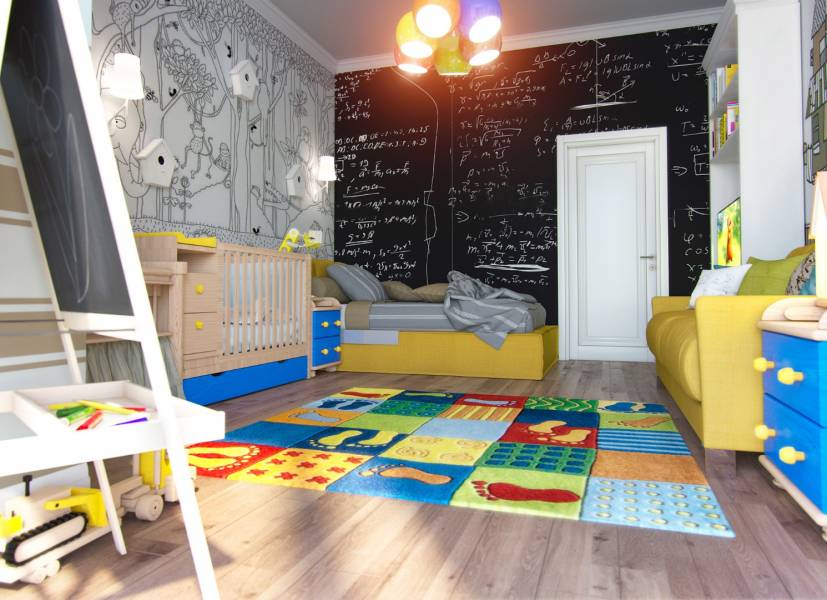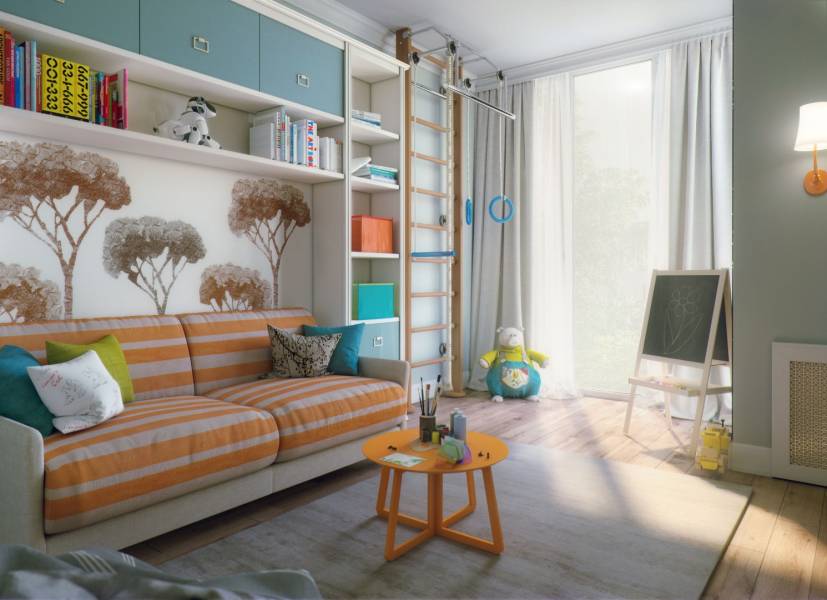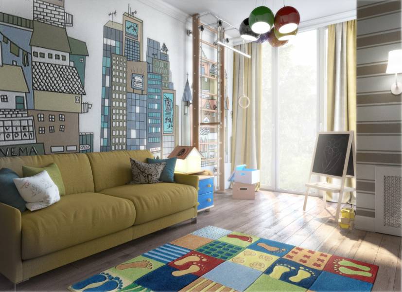 - гостиная, столовая, кухня, спальня, детская, коридор, ванная