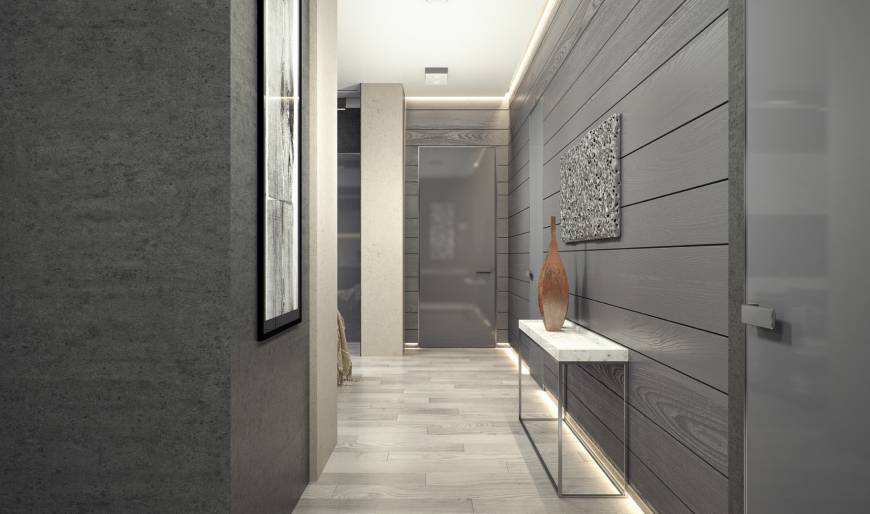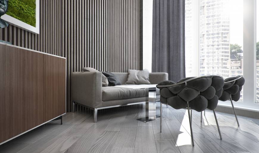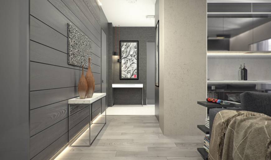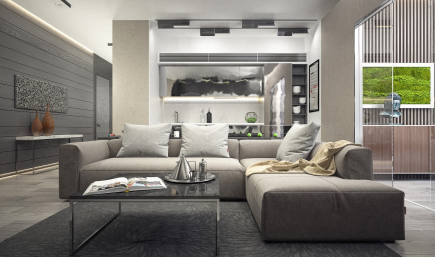 Эта квартира площадью 93 кв. метра принадлежит холостяку. Хозяин попросил оформить дом в "мужском" стиле. Дизайнеру студии Artpartner это удалось. Основная цветовая гамма в пространстве серая. "Брутальность" разбавлена мягким и теплым бежевым тоном. Именно благодаря этому интерьер выглядит не холодным и аскетичным, а теплым и уютным. Непривычные и на первый взгляд непрактичные глянцевые фасады кухни выполнены из специального материала, не оставляющего следов.