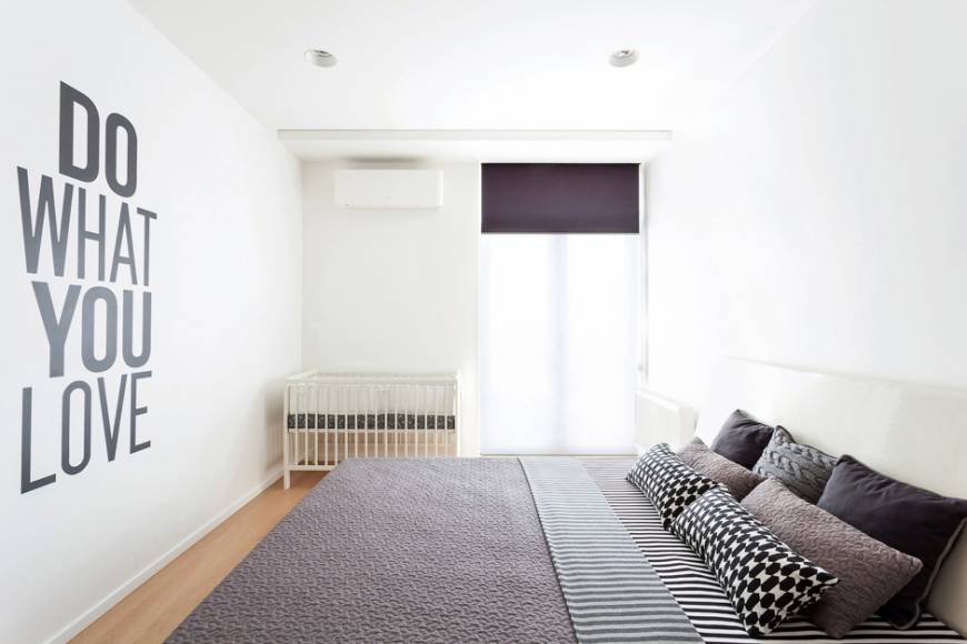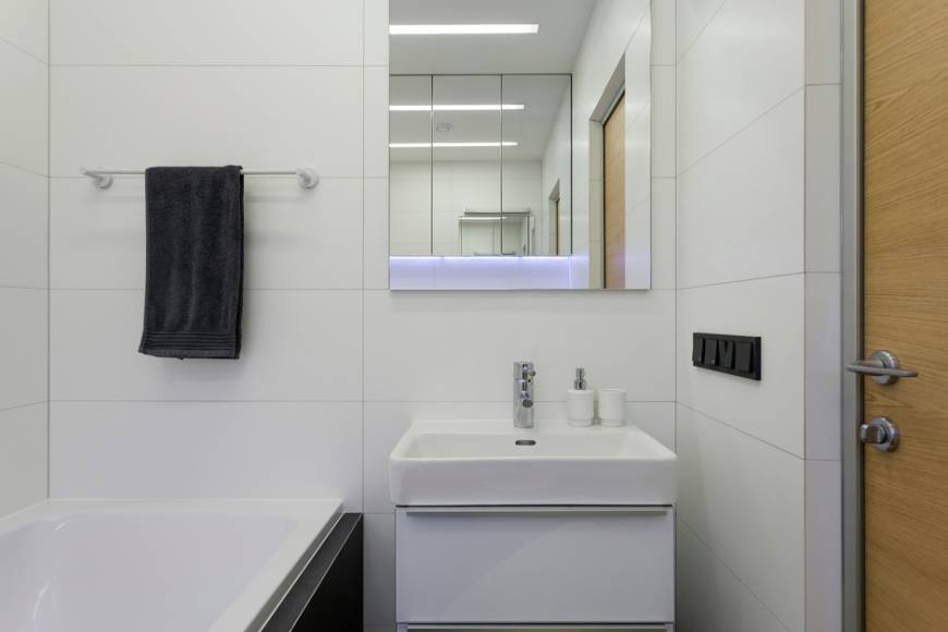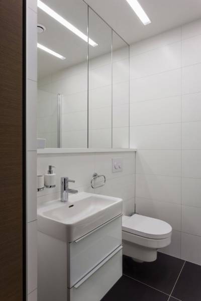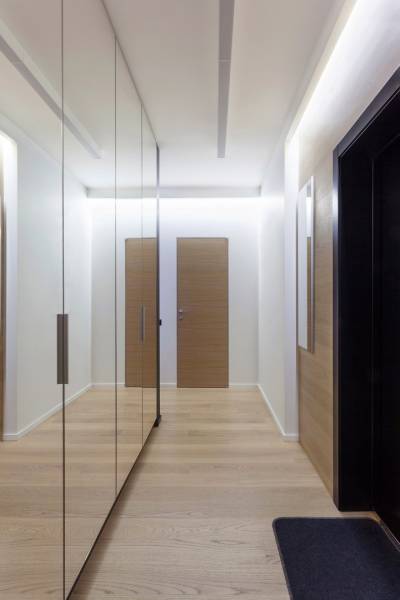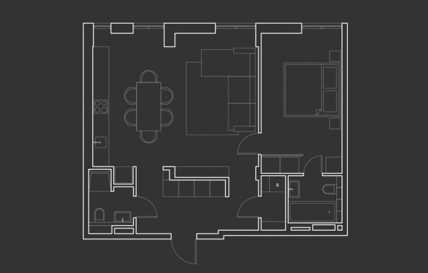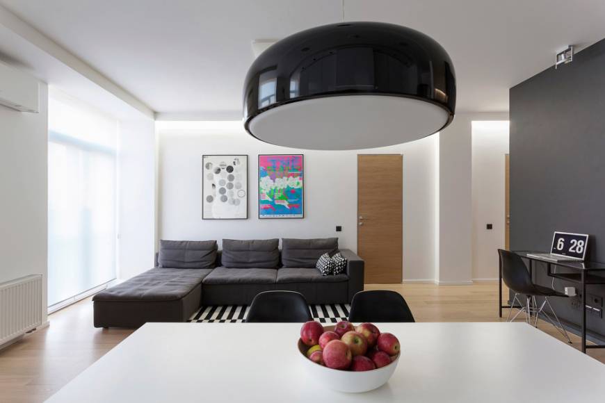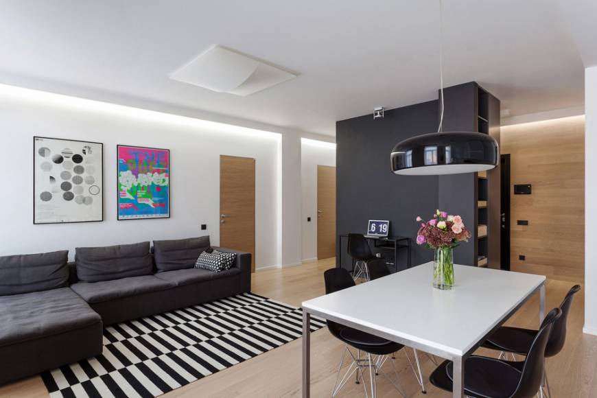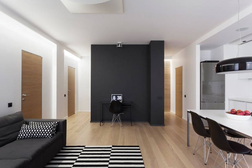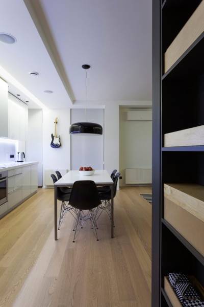 Основным требованием было, вписать в небольшую квартиру необходимый для комфорта перечень функциональных зон и помещений, при этом сделать открытое и функциональное пространство. Гостиная с большим удобным диваном соединяется в единое пространство с белоснежной кухней и столовой, создавая уютную атмосферу для общения с друзьями и семьей. В приватной зоне архитекторам удалось не только вместить отдельный санузел, вход в который скрыт за раздвижным фасадом гардеробной, но и вычленить из пространства санузла отдельную зону для прачечной. Монохромная гамма с элементами выбеленного дуба создает уют и дополняет интерьер пространства.