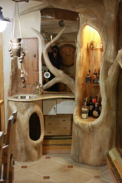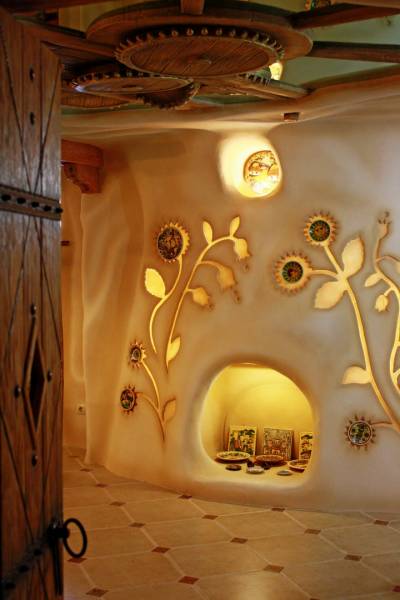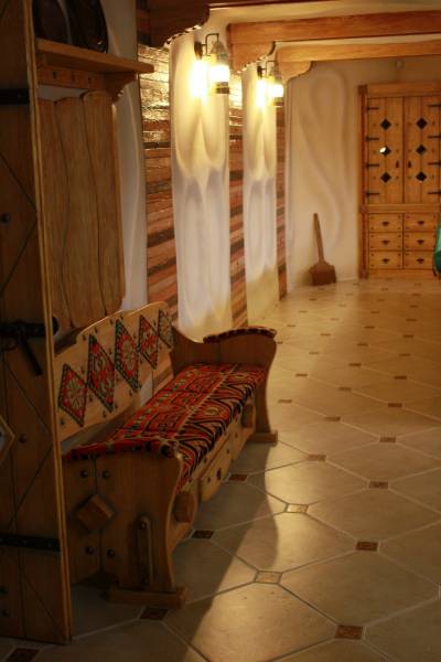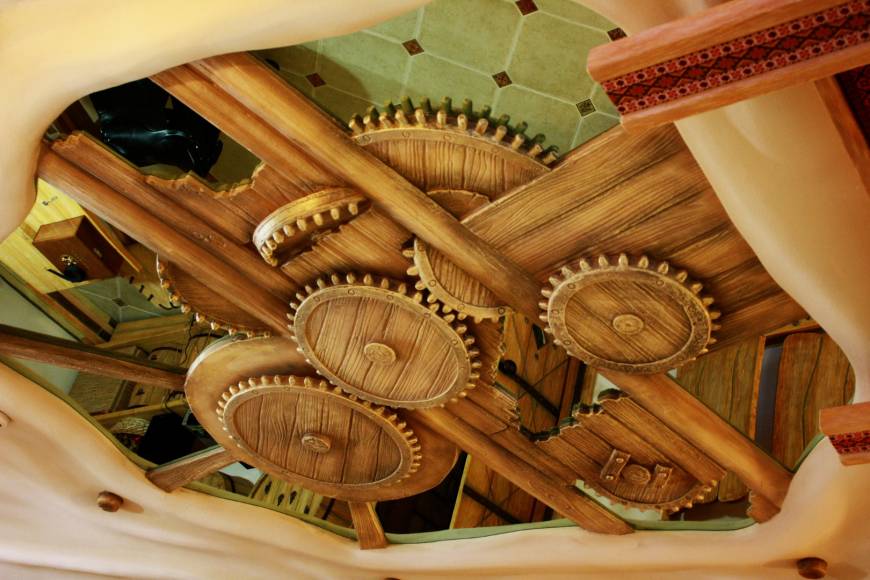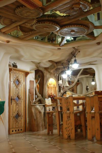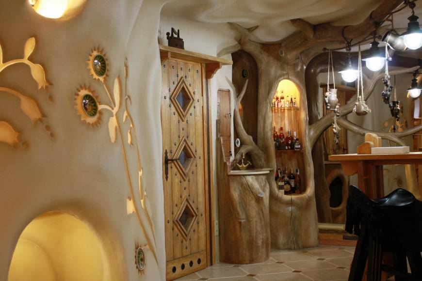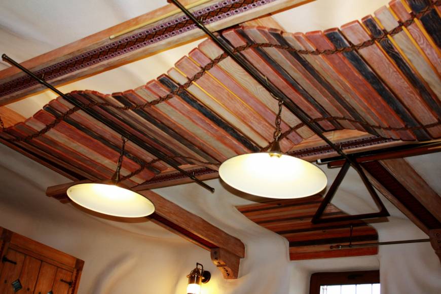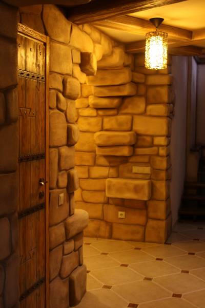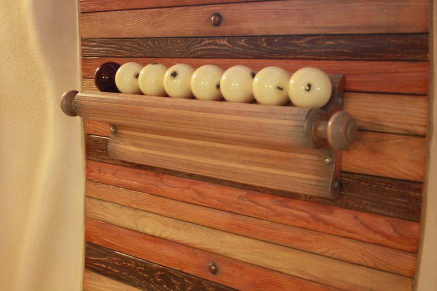 Создаётся впечатление, что это не настоящая бильярдная, а сказочный домик. Все стены отделаны декоративной мазанкой. Здесь нет прямых углов. Здесь всё гибко, как в нашем воображении. Всё органично переходит друг в друга.