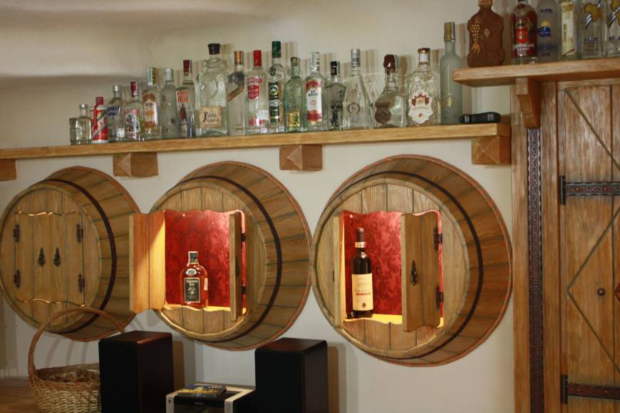 В отделке присутствует много дерева и деревянной мебели, выполненной на заказ по отдельным эскизам и пожеланиям хозяина. В углу рядом со столом находится декоративный мини-бар в виде дерева, а над бильярдным столом мы повесили люстру-волну. Струящийся из-под неё свет придаёт загадочности и волшебной атмосферы зоне игры.