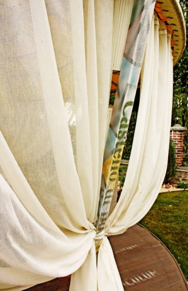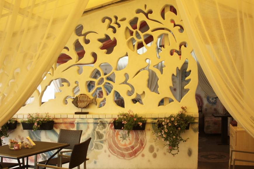 Вся стилистика выдержана в лёгком средиземноморском стиле. С большим количеством ткани и нежных подвесов.