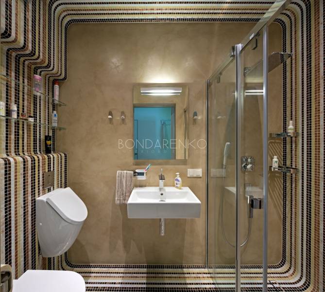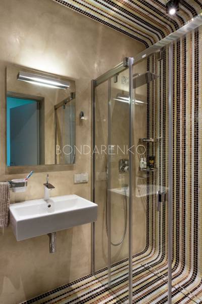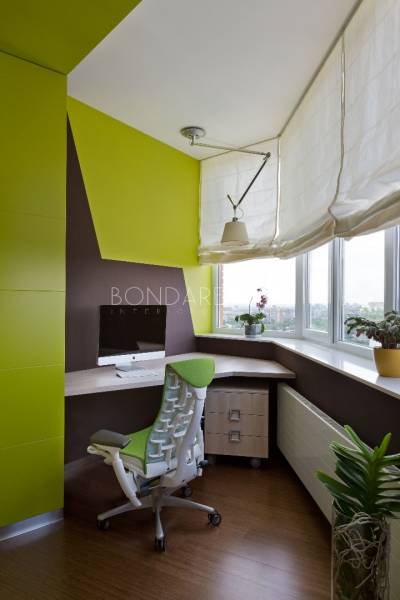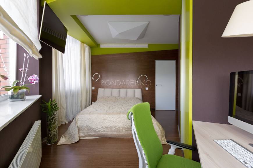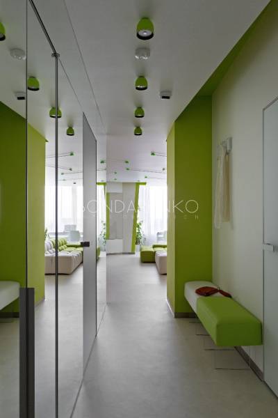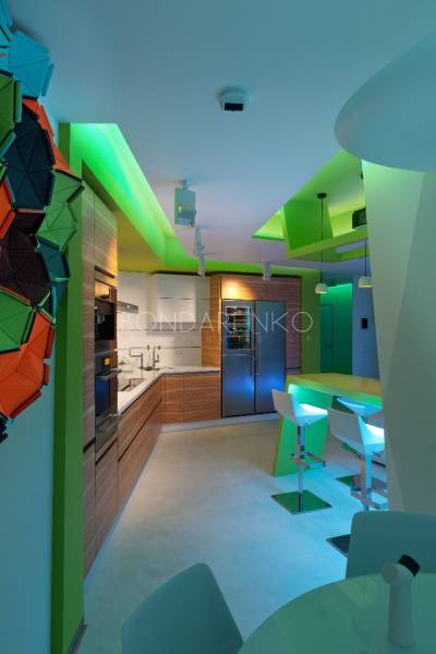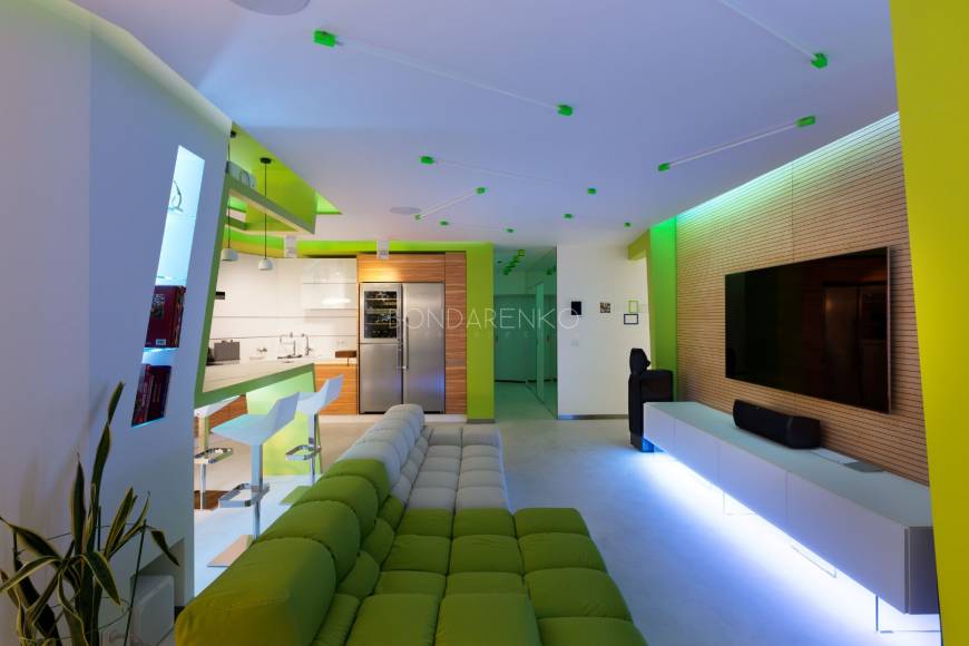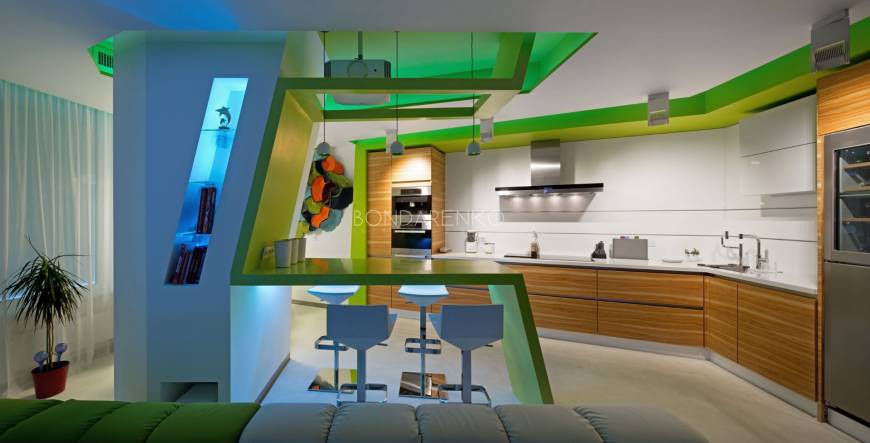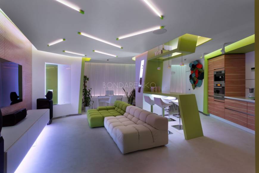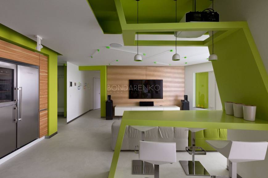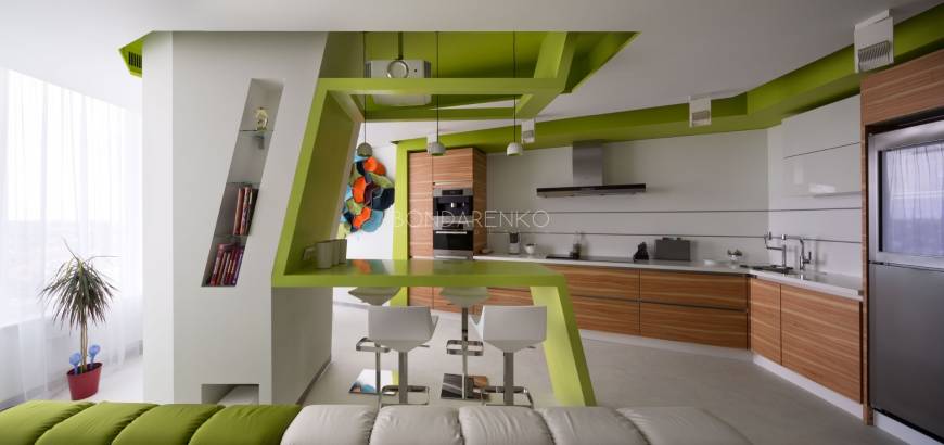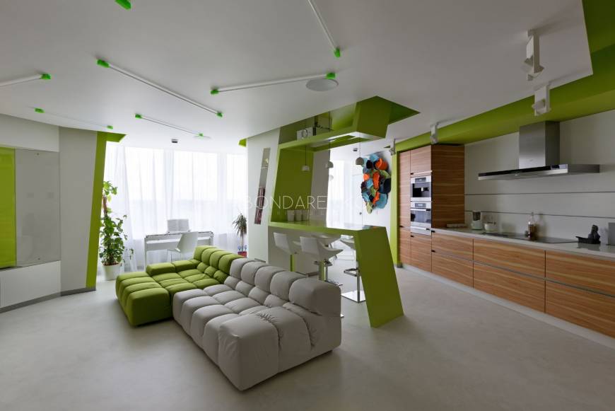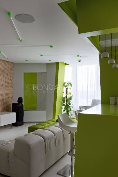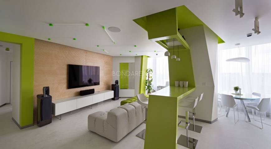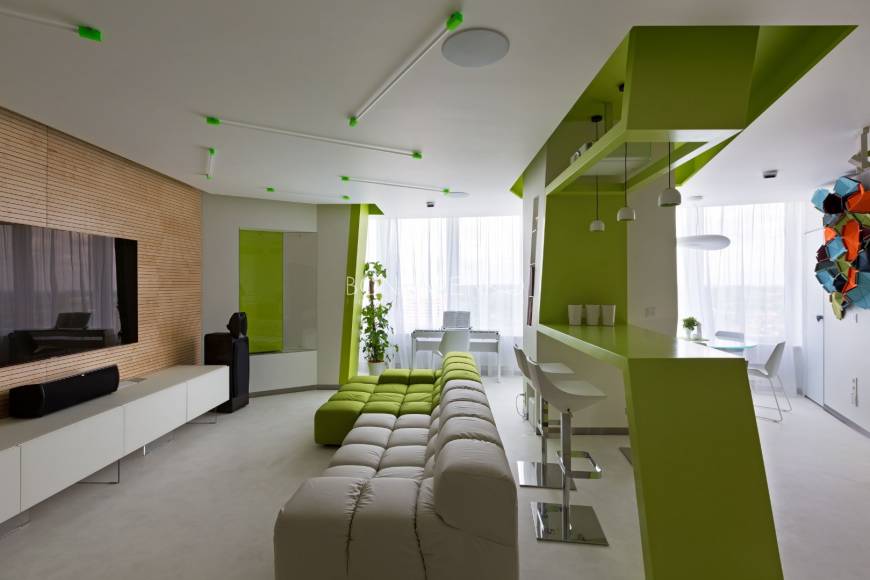Концептуальность и высокие технологии . Владельцы квартиры, молодая пара, стремились избегать шаблонов не только впроектировании, но даже в выборе материалов и хотели получить яркий, необычный, но при этом функциональный интерьер. Кроме того, к авангардным решениям подталкивали и особенности помещения: организация пространства в виде прямоугольных комнат ограничивала функциональность части площади. Поэтому было принято решение развернуть все стены под углом, что позволило выделить место под гардеробную комнату при спальне и разместить более длинную кухню, чьи нестандартные пропорции придали бы пространству динамики. Цветовая палитра интерьера была определена городским окружением: из панорамных окон в гостиной открывается выразительная перспектива на парк. Доминируют зеленые, белые оттенки, а яркие цвета аксессуаров и мебели создают цельность. Стилистическая концепция строится на принципе чистоты форм, максимальная открытость и функциональность, обилие света и свободного пространства, высокие технологии и новейшие отделочные материалы, строгость форм и лаконичность линий, которые плавно перетекают из одного помещения в другое, объединяя отдельные функциональные зоны в единое целое.