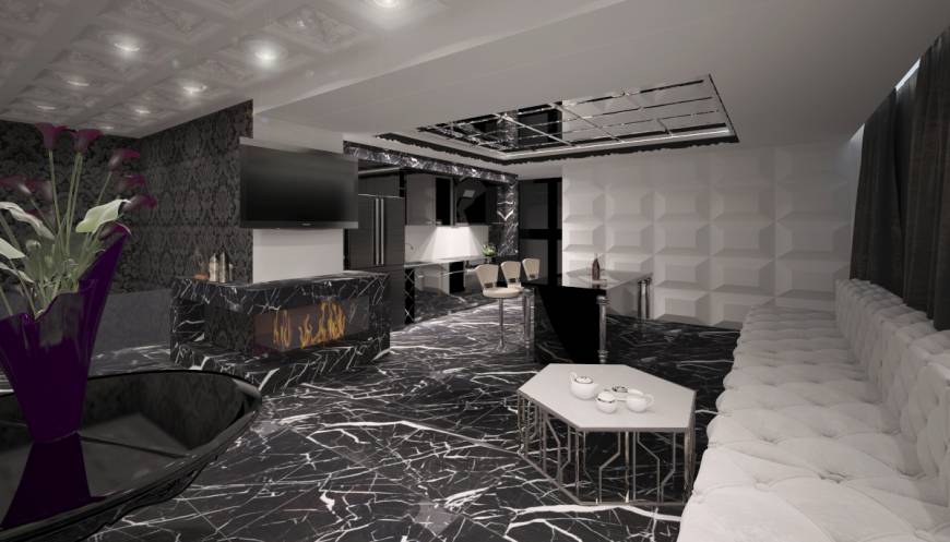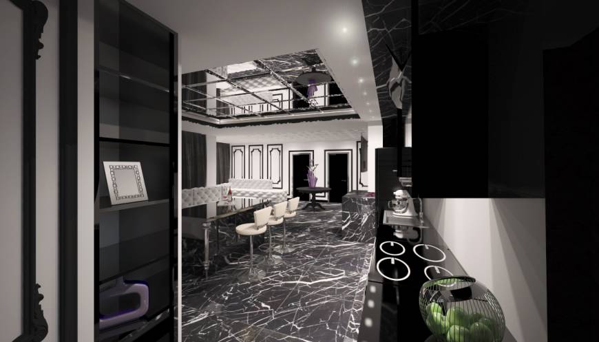 Яркая и динамичная двух-этажная квартира. Особенность этого объекта – контраст во всем. Гармоничное сочетание черного и белого, современности и классики. Большое количество стекла и глянцевых поверхностей, сбалансировано правильным многофункциональным освещением.