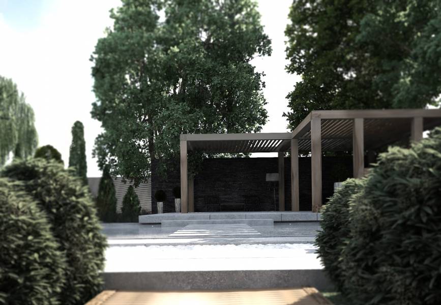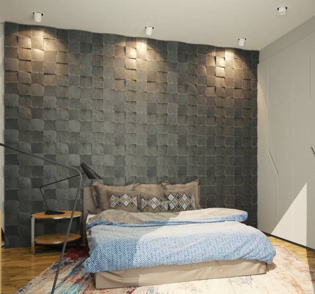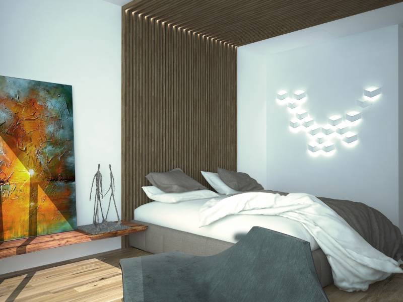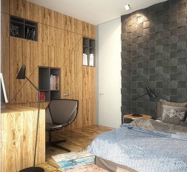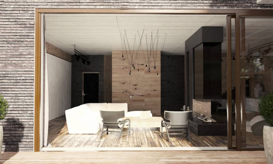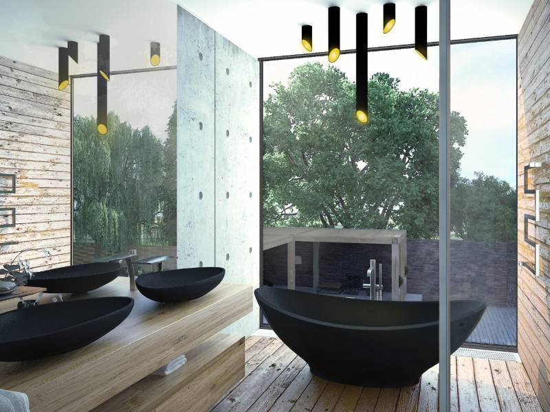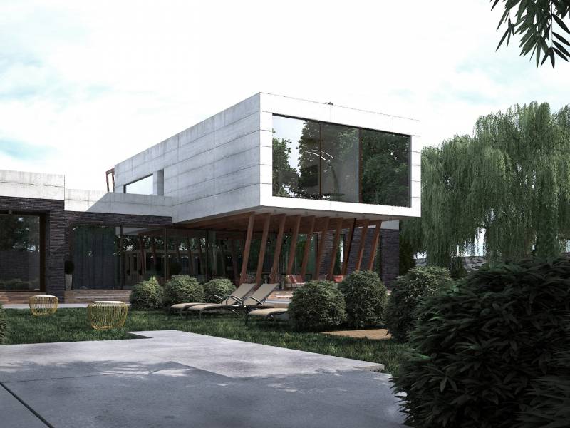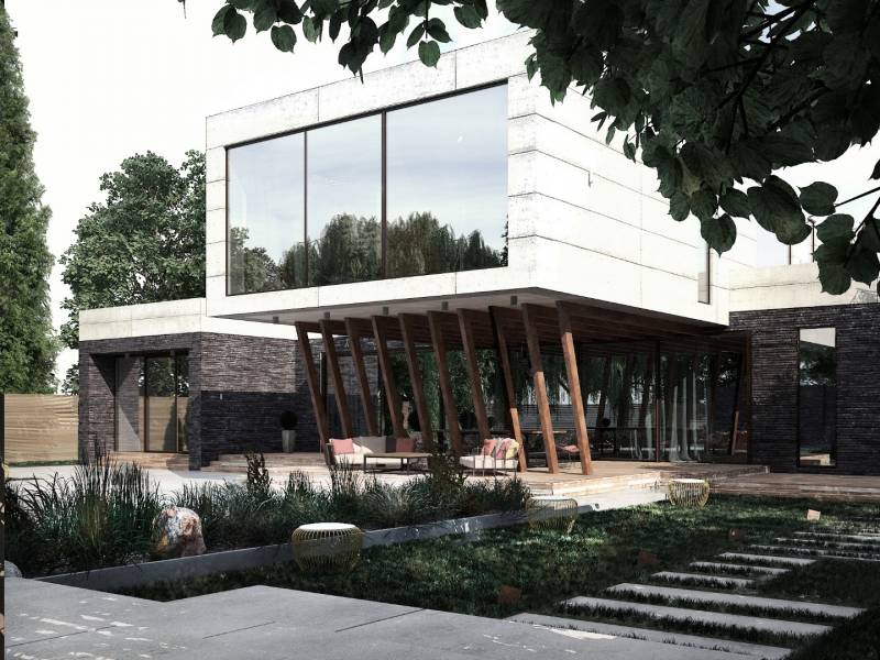 Дом из бетона с панорамными окнами. Внутри обилие дерева и едва заметные декоративные предметы славянского происхождения.