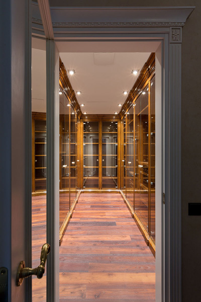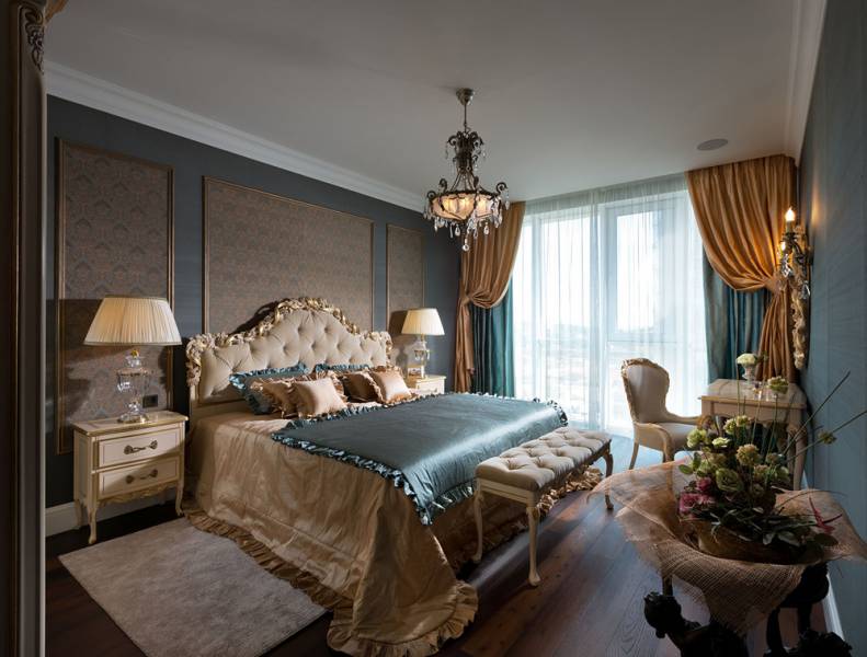 Основным пожеланием заказчиков было воссоздание некой, дворцовой, замковой стилистики, но в контексте второго -не основного жилища -двухуровневой квартиры в высотном доме, что собственно предопределило наличие непременных атрибутов –обшивки стен буазери, шелковых обоев с характерным орнаментом ,сложенных по стилистике осветительных приборов и свойственной этому стилю ,гамме.