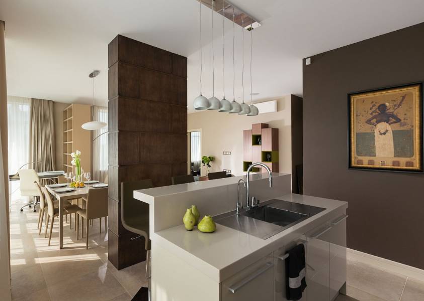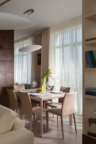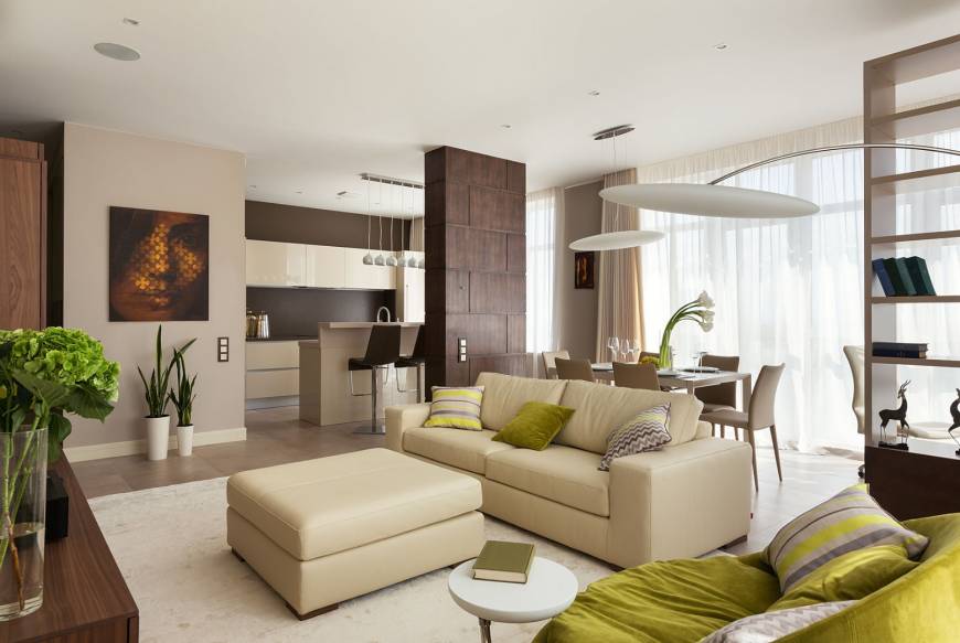 Цветовое решение базируется на сочетании спокойных бежево-коричневых цветов и приятного салатового цвета, присутствующего во многих деталях квартиры, которые формируют динамичную среду, связывают все зоны квартиры в единое пространство.