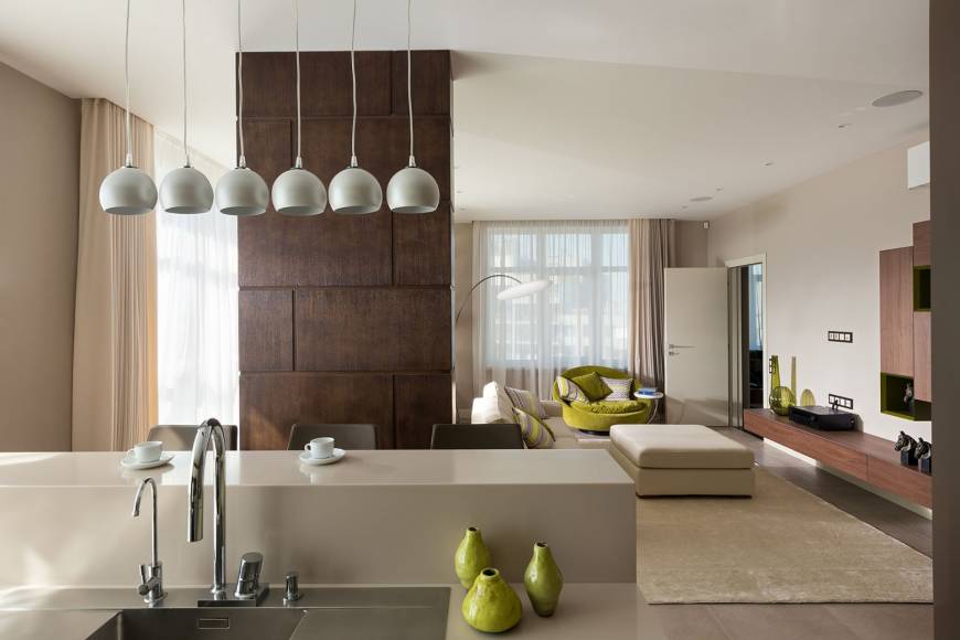 Сложные конструктивные элементы, такие как монолитный пилон между гостиной и кухней, мы задекорировали деревянными панелями, поддерживающими общую цветовую и фактурную композицию совмещенной площади.