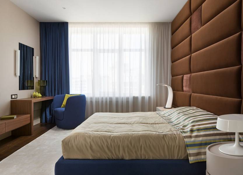 И, говоря об удовольствиях, стоит отметить, что и самая заветная мечта Заказчицы иметь отделенную от общей зоны спальню со своим санузлом и гардеробной, стала реальностью…Мягкая обивка стены, сложная цветовая компоновка и смелость в фактурах-всё это комплимент вкусу Хозяйки…