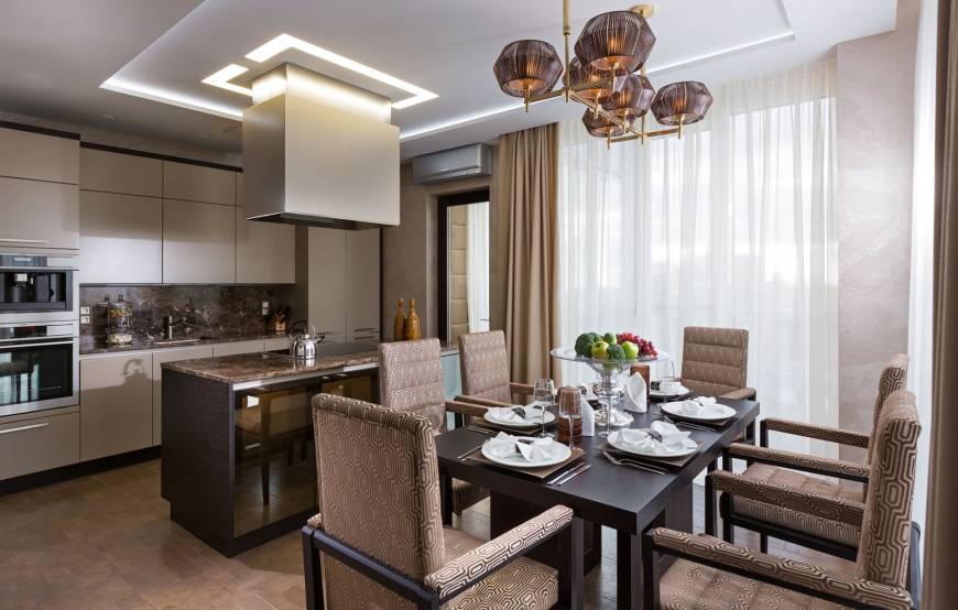 Продуманное планировочное решение позволило создать цельную, просторную презентационную зону в центре квартиры. Два приватных помещения расположены достаточно далеко друг от друга. В квартире обустроена хорошо оборудованная кухня со столом-островом. Обеденная группа размещена у больших панорамных окон из которых открывается шикарный вид на город. Пара диванов в гостиной располагает к отдыху у камина, просмотру фильмов и дружескому общению.