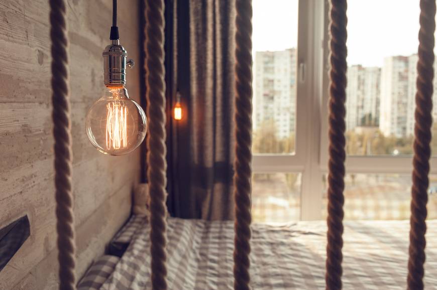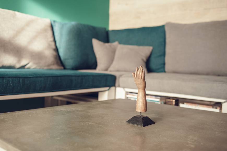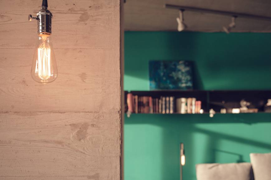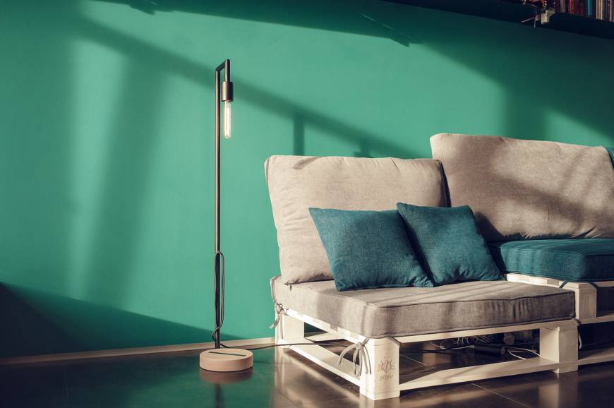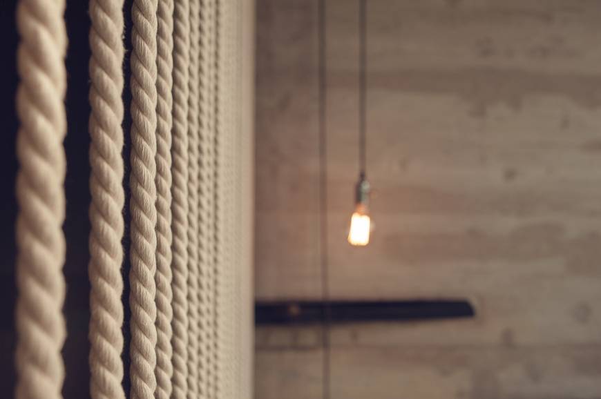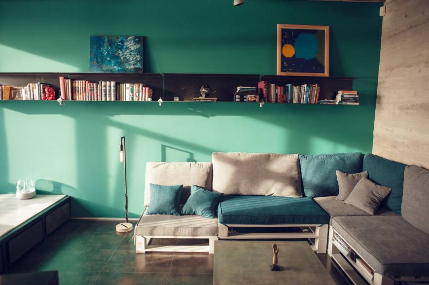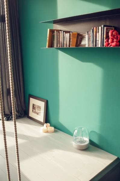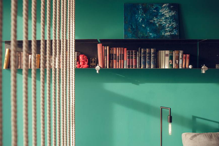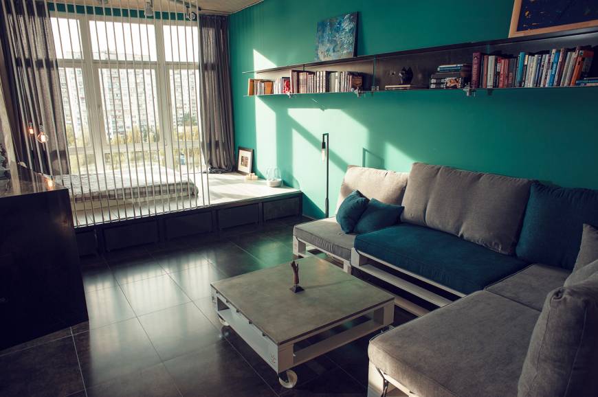 First of all we planed the apartment zoning into a public and private space. We raised the sleeping area near the window on 35-sm podium covered with naturally toned wood. Deep drawers under the podium were a perfect storage arrangement solution. The private space was separated from the main room with decorative rope installation, adding some comfort and warm feeling. The lounge zone is design in a peculiar loft stylistic: the sofa’s frame is made of raw metal and industrial pallets, the surface of the tea table is made of unpolished concrete. 5-meter long, raw metal shelving unit is mounted above the sofa and creates the main interest in the loft apartment. The shelf consists of 4 parts connected with each other by technical vise. The combination of controversial textures, crude metal surfaces and dimmed emerald color pallet makes a bold statement in this FILD creation. The whole project was accomplished in a short time limit - 28 days»