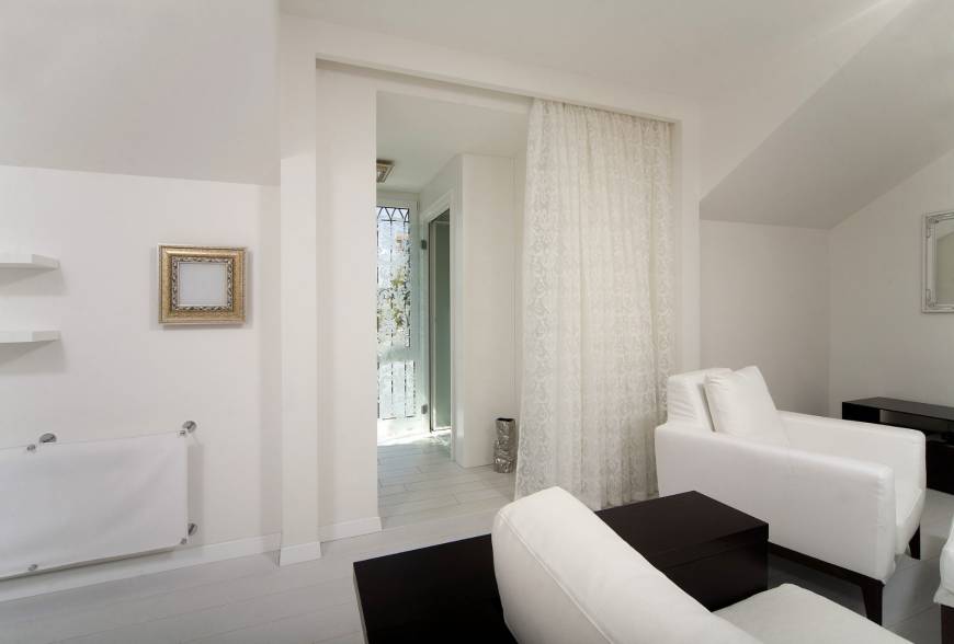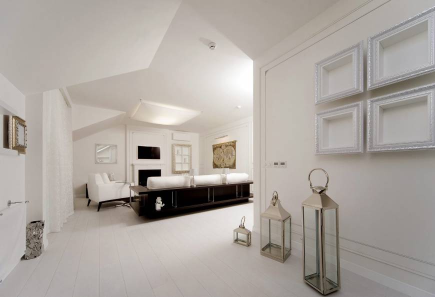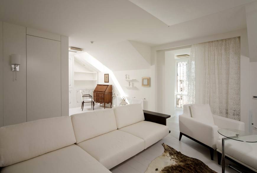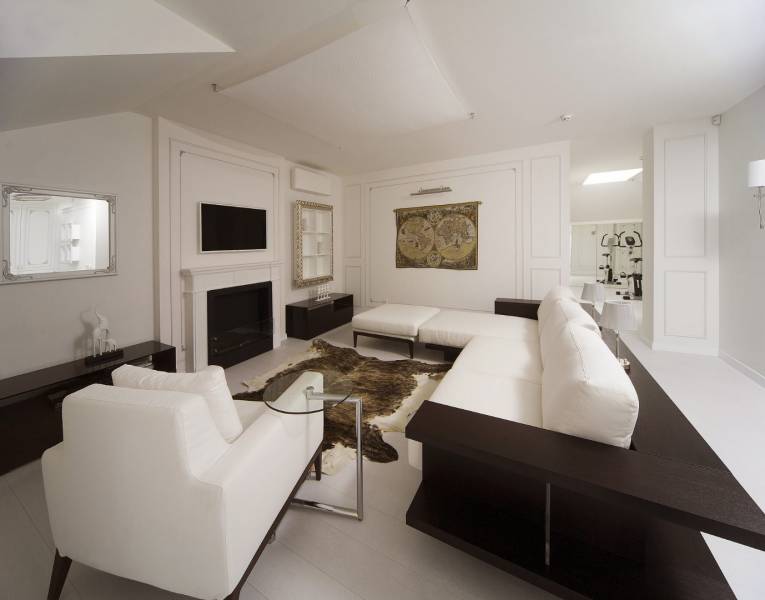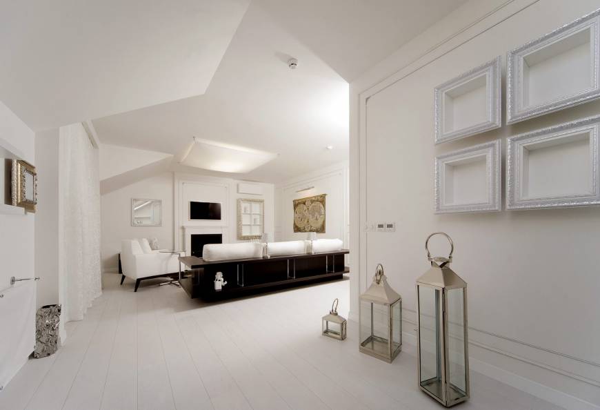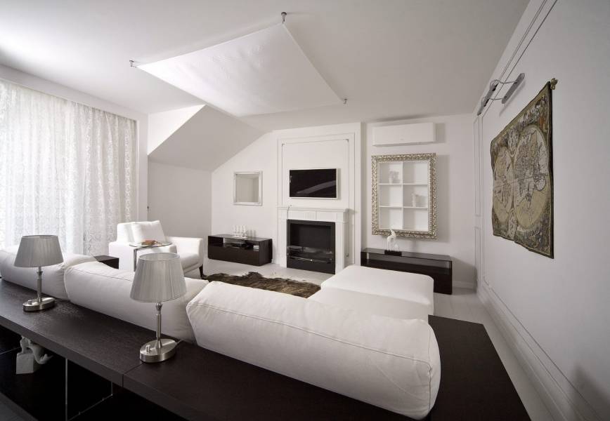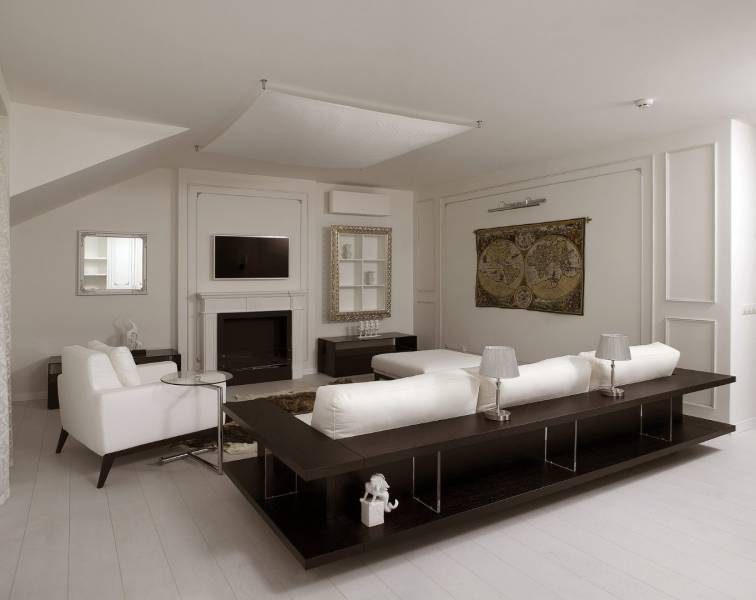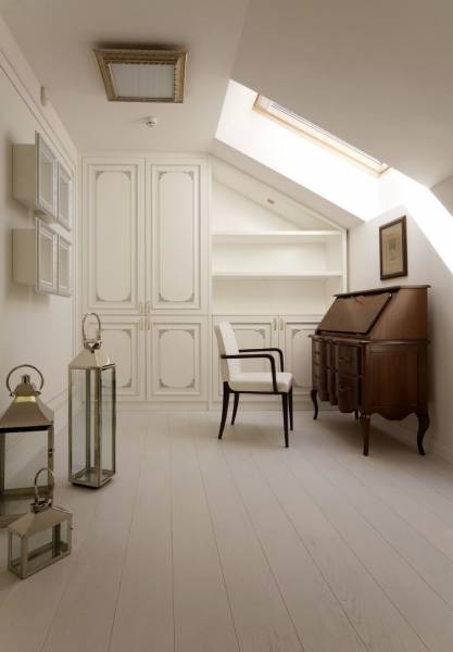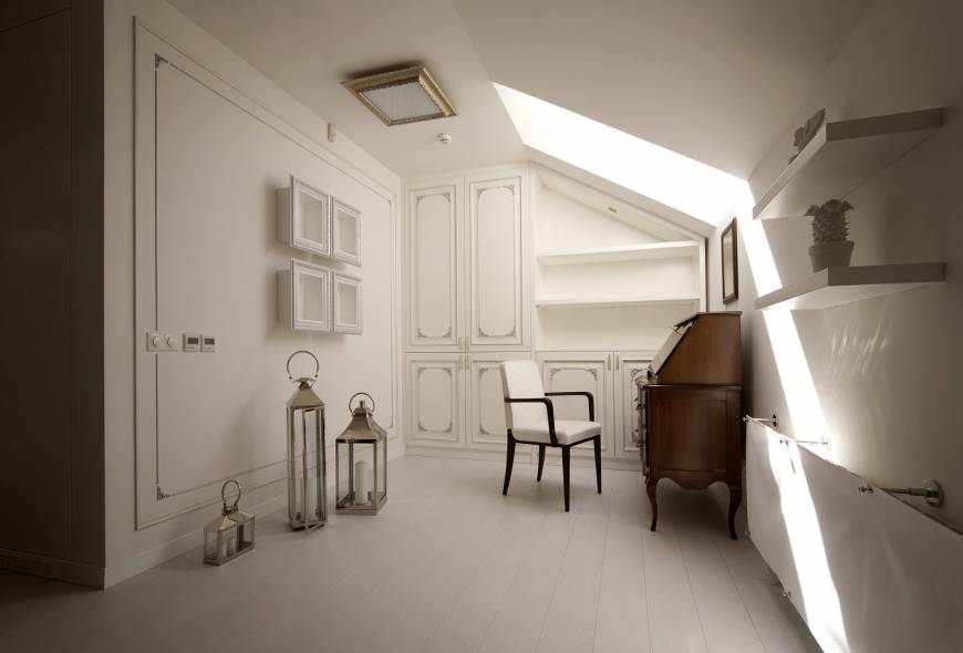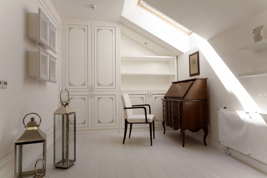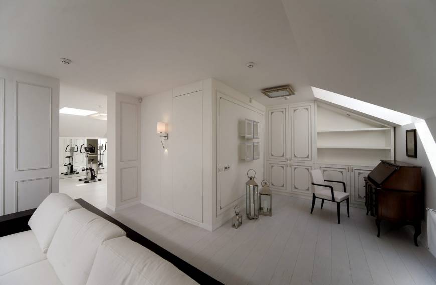 Наш заказчик, живя в только что отремонтированной квартире, приобрел квартиру над собой, на последнем мансардном этаже 6-этажного дома. Главная задача, с которой мы должны были справиться - это объединение двух квартир. Ничего необычного, но нам было поставлено условие – не портить ремонт на нижнем этаже. Он очень свежий и его жалко. Таким образом, у нас появился интересный и сложный в решении объект. Нужно было объединить квартиры лестницей, а перекрытия трогать нельзя !? Было проделано очень много работы по поиску вариантов устройства лестницы на фасадах. На главном фасаде мы исключили сразу возможность стройки, по известным причинам. Тогда мы рассмотрели вариант на торцевом фасаде. Он оказался глухой, идеально подходивший для нашей лестницы, но и он не случился, т.к. под ним оказалась подстанция. И, хотя мы узнали, что она не рабочая, оказалось, что придомовая территория может быть кем-то куплена и застроена. Или нам ее выкупать, что очень дорого. И, таким образом у нас остался только один вариант – использовать третий фасад, который даже дворовым назвать нельзя. Он очень близко расположен с соседним домом и окна нашей квартиры выходят прямо на его глухую стену. Но, с другой стороны, это и хорошо. Тут нам никто никак не помешает. К тому же на нижнем уровне уже был существующий балкон и мы предполагали, что, устроив балкон на верхнем уровне, нам удастся их связать. Это был единственный вариант, где можно устроить лестницу. Но как мы не старались ее там вписать, у нас ничего не получалось. Слишком маленький был вынос балкона и двухмаршевая лестница не проходила по ширине существующего балкона, он узкий, а длина балкона не позволяла устроить одномаршевую лестницу, слишком короткий. Выходил только вариант чердачной лестницы, но это заказчика не устраивало. Мы не строили новый балкон, до тех пор, пока не нашли решение, которое устроило хозяина. Мы решили построить лифт. Это было оригинально и решало все задачи, хотя само по себе это решение стало для нас еще более сложной задачей, чем решаемые ранее. Мы обратились в специализированные фирмы, занимающиеся лифтами, и везде получили либо отказ, либо нам насчитывали такие деньги, что можно было купить еще одну квартиру. Но даже за такие деньги мы не могли сделать лифт, т.к. требовалось устройство приямка или машинного отделения.