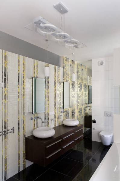 На базе всего оговоренного, я принял решение спрятать все самые явные кухонные приборы за ширму. Ширму я декорировал огромным цельным куском зеркала, что уже само по себе привлекает внимание. Это растворило ее и надежно спрятало кухню, отвлекая внимание входящего на свой собственный образ. И из-за того, что зеркало расположено под углом, интерьер исказился и вообще разбился на непонятные части, пересекающие друг друга и выплывающие одна из другой. Для усиления эффекта и, исходя из функциональной необходимости, я разделил зоны кухни и прихожей ( переговорной ) цветом плитки на полу. Таким образом, решились все задачи одним махом. Ну, а мягкий диван и журнальный столик – все, что надо для переговоров, логично завершили общую композицию.