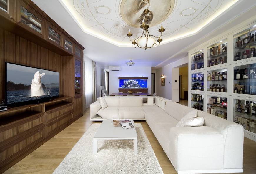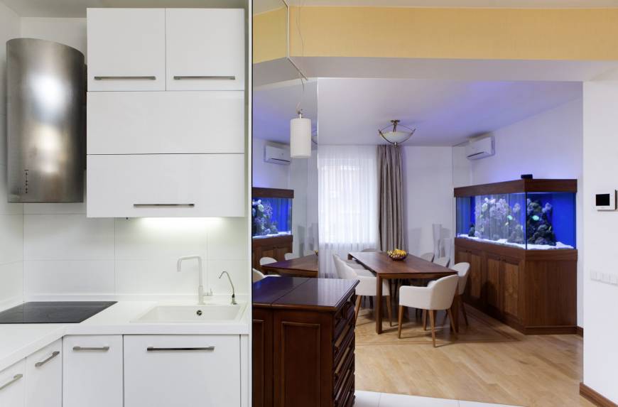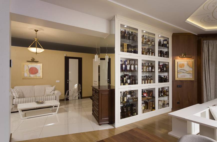 В гостиной тоже есть свои изюминки. Например, шкаф, который проектировался специально для коллекции виски. Это коллекция хозяина и, надо сказать, очень впечатляющая. Хочется отметить что именно, благодаря ей появилось название проекта и, собственно, началась работа над интерьером. Надо иметь завидную выдержку и самообладание, чтобы, любя так страстно этот напиток, просто смотреть на него каждый день, и все ! И этот человек этими качествами владеет. А коллекция его достойна того, чтобы весь интерьер начать именно с нее. Так все и было. Коллекция должна была занимать главное место в интерьере и все должно вращаться вокруг нее. Вообще мебель в гостиной проектировалась с таким расчетом, чтобы занимать как можно меньше, а вмещать как можно больше. Поэтому шкафами и полками занят практически весть периметр гостиной. В столовой зоне расположен роскошный морской аквариум. Он пока еще молодой, но когда подрастет – флора и фауна его будут гораздо пышней и разнообразней.