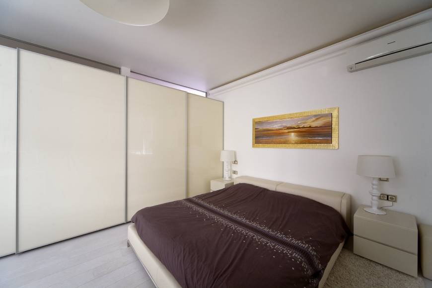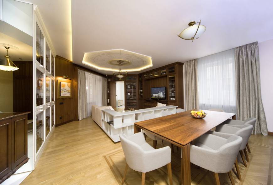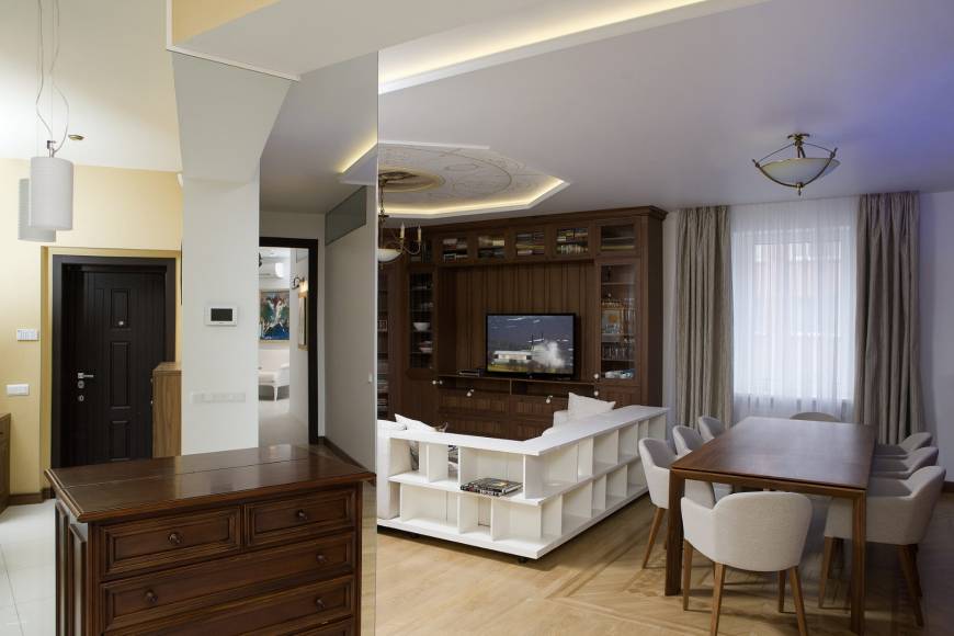Задача была создать современный интерьер с элементами классики, не нагруженный и , на сколько это позволяла высота, объемно-просторный. В семье 4 человека. На такой площади свободно все разместились. В принципе планировка просто функциональна, без каких-либо не стандартных решений. Единственное, на что хотелось обратить внимание – это прихожая. Да, это не самая привлекательная часть квартиры, но в нашем случае она несет в себе гораздо больше функций, чем просто входная зона. Хозяин квартиры деловой человек. Некоторые встречи он проводит дома, но не желает заводить гостей в жилую часть. Поэтому просил сделать так, чтобы прихожая была как можно меньше прихожей, а больше комнатой для переговоров и немножко кухней. Нужно устроить все так, чтобы входящий чувствовал бы себя как в офисе, сильно не расслаблялся и, при этом, он не должен глазеть на квартиру. А кухня нужна в минимальной наборке, потому что мы чаще кушаем в ресторане. Она должна быть спрятана и не бросаться в глаза.