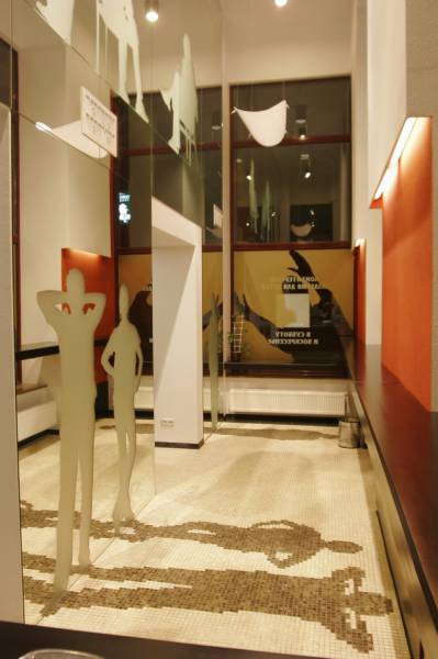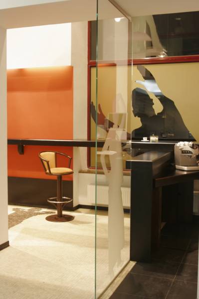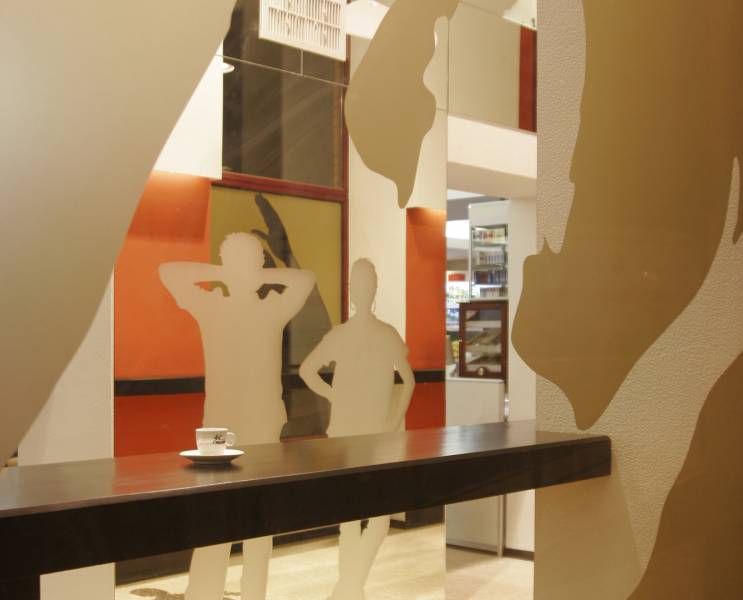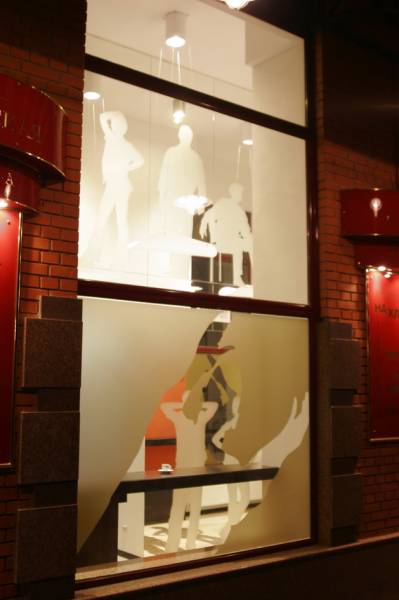 Ресторан расположен в доме, с которого в Харькове началось элитное строительство. Ориентир ресторана - жильцы дома. Предполагалось, что только для жильцов он и будет использоваться. Заказы завтраков, обедов, ужинов, праздничных столов и т.д. Но время показало, что случайные прохожие - тоже не будут лишними клиентами. Но, не планируя объект для общего пользования, никто не думал о его внешнем виде. И теперь, когда стал вопрос его "выхода в свет", ему просто необходимо красивое лицо. Я сделал интерьер частью улицы. Так как окна витрины очень близко расположены к прохожим, я решил просто привлечь внимание необычными витринами, которые как бы заглядывают внутрь ресторана. Внутри расположены силуэты посетителей, которые были списаны с владельцев и работников этого ресторана.