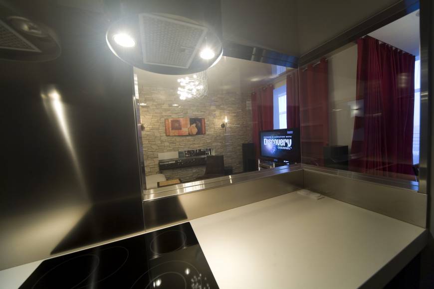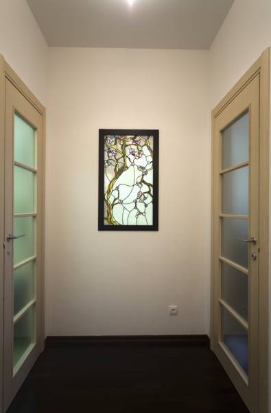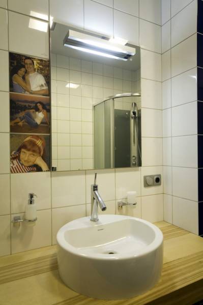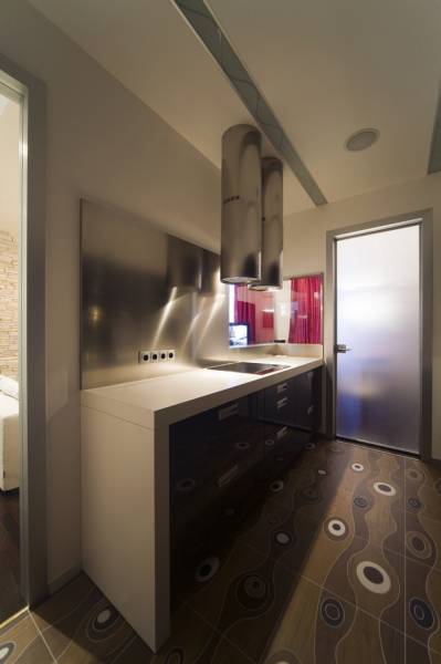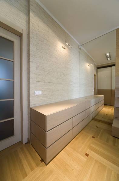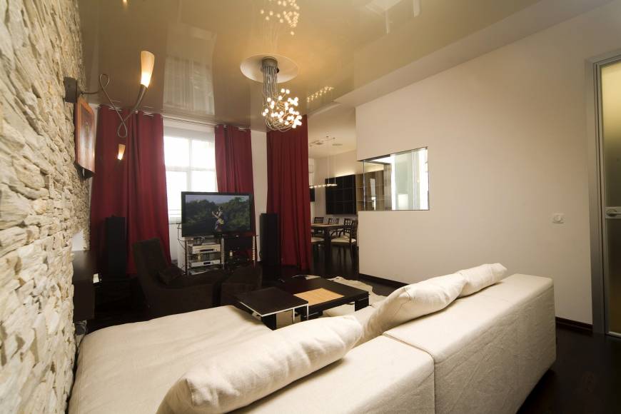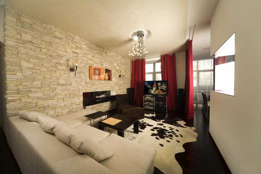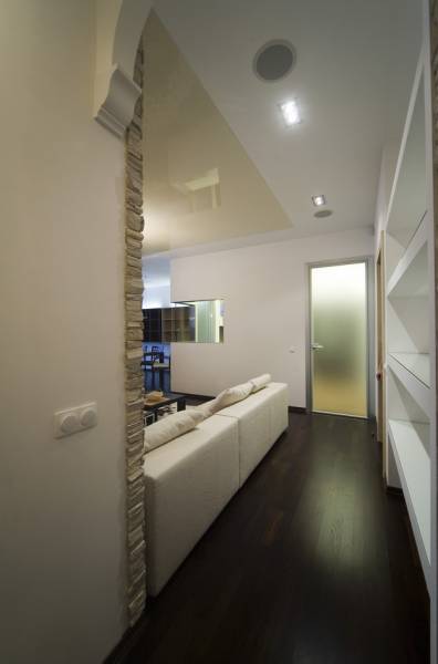 Киевская новостройка. Использование чистого белого цвета на гладкой поверхности на контрасте с камнем и цветовыми акцентами - главная тема интерьера.