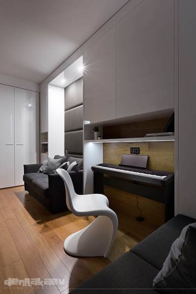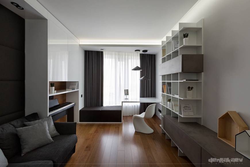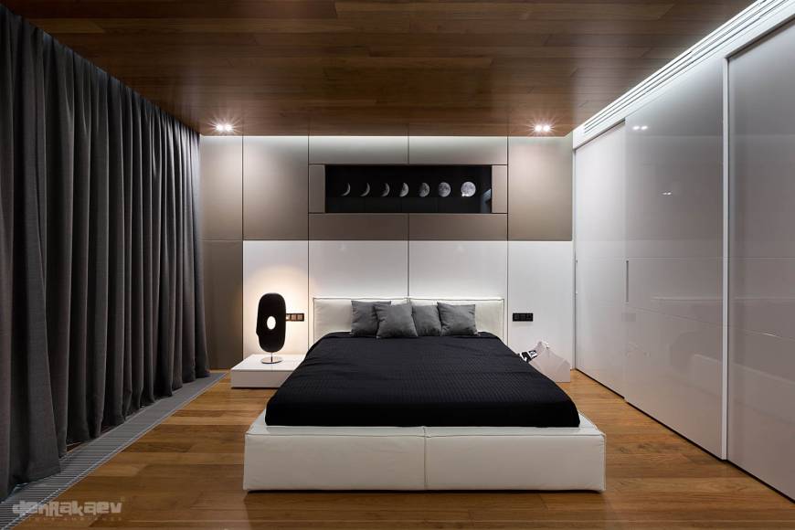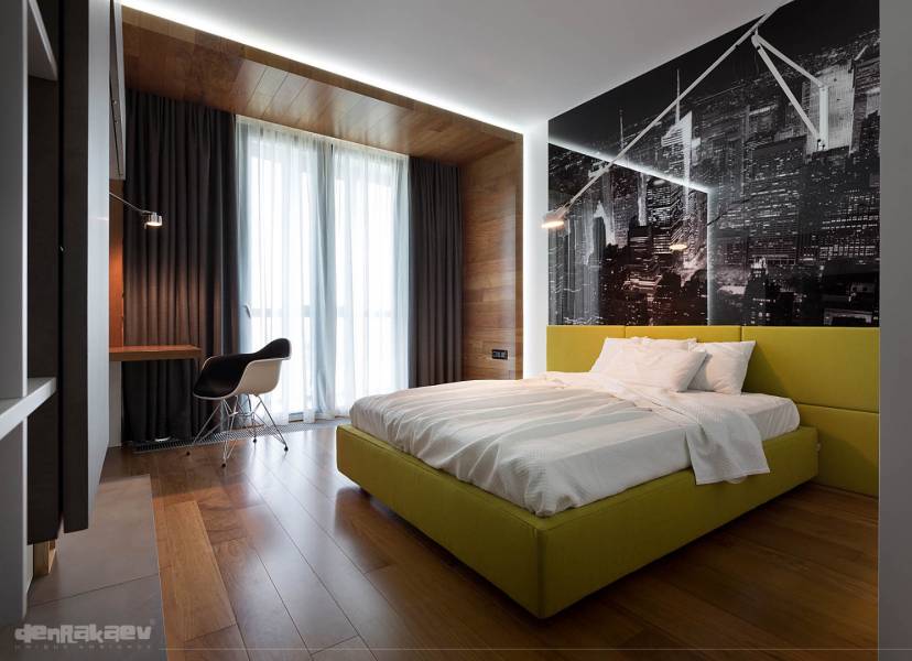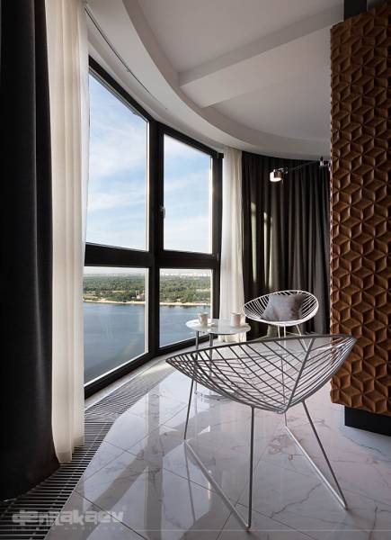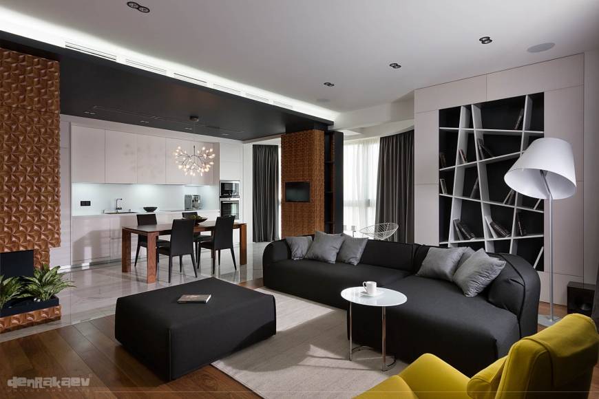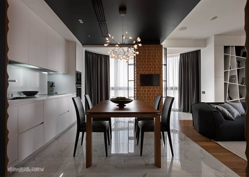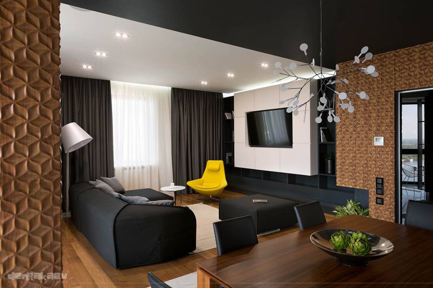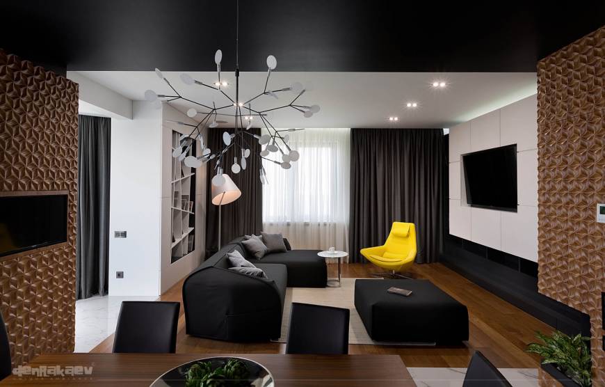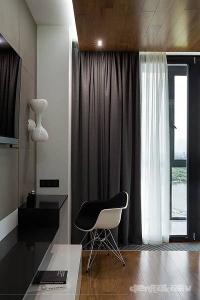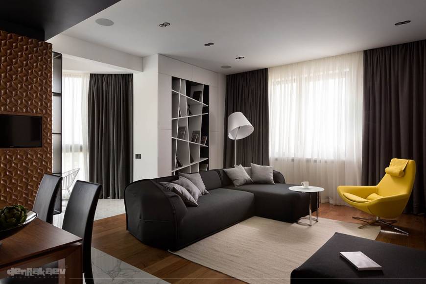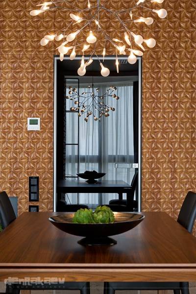Владельцы апартаментов настоящими ценителями качественных и практичных вещей, плюс очень любят путешествовать. Интерьер в полной мере отображает мировоззрение своих хозяев. Строгий пуризм здесь разбавлен тёплым этно. Приём, при котором сочетаются простые, прямолинейные формы с декоративностью и криволинейностью этнических мотивов, создаёт уникальный эффект отрешенности от суеты большого города.