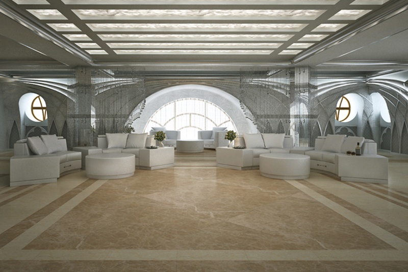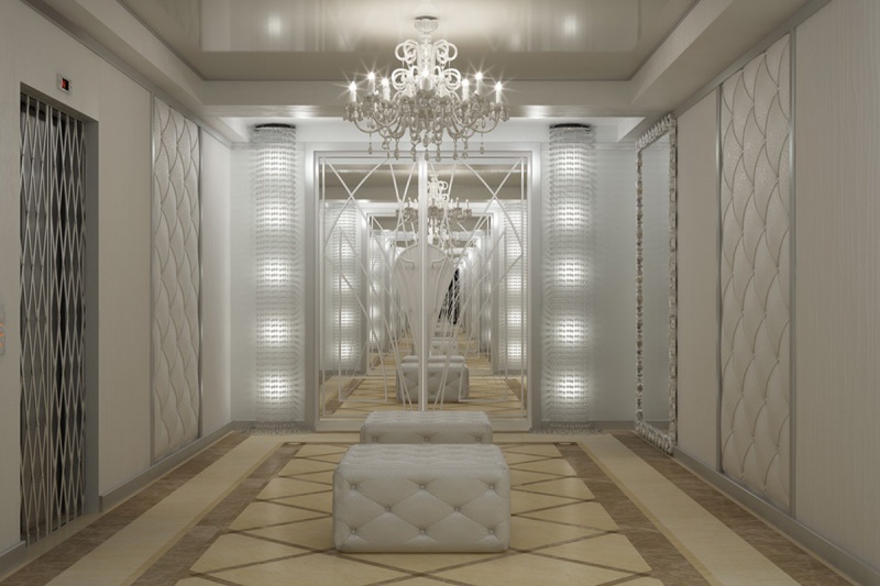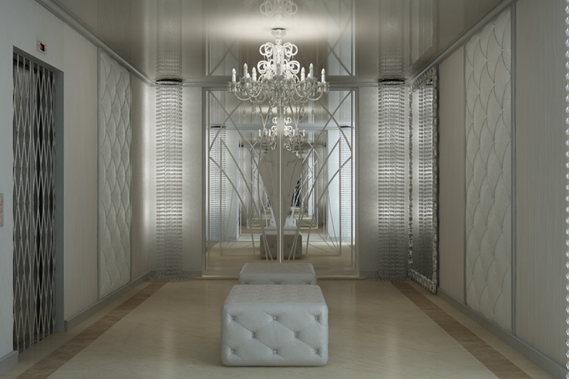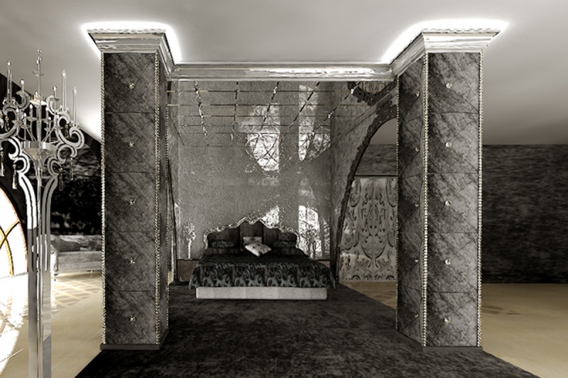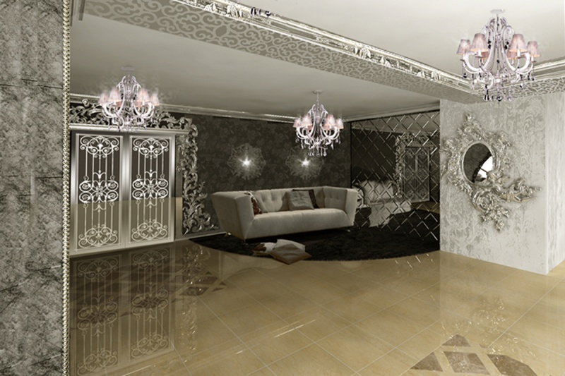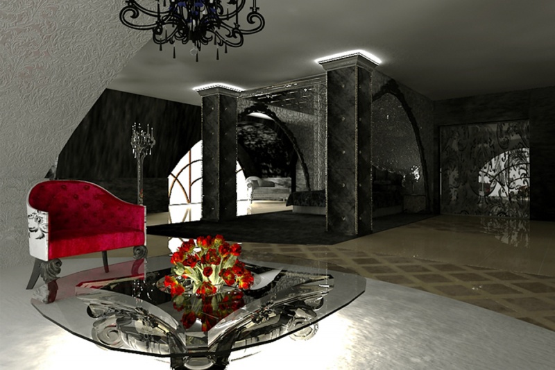 Сложный, эклектический интерьер этих апартаментов объединяет между собой как вычурные барочные рамы и зеркала так и строгие готические своды и розы. Контрастное цветовое решение сочетается с более мягкой гаммой, подчёркивая зонирование пространства.