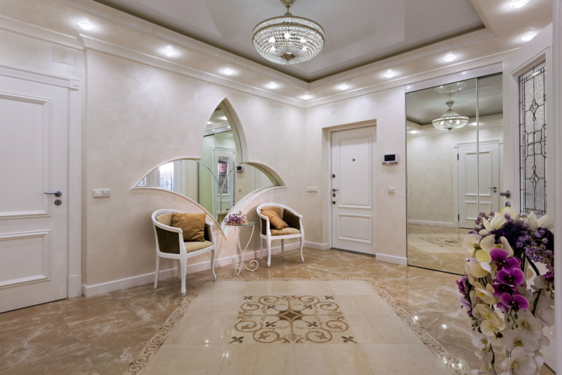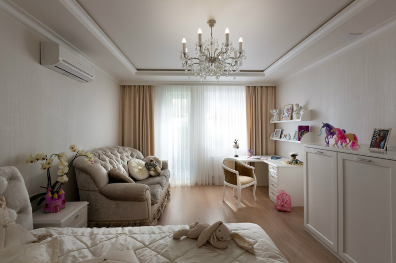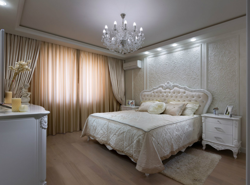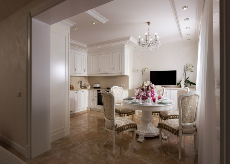 Уютная и светлая квартира выполнена в стиле современной классики. В интерьере преобладают белый и молочно-бежевые тона, мягкие, мерцающие текстуры. Большое количество освещения дополняет общий образ, заполняя пространство тёплым светом, играя в зеркальных отражениях, создавая праздничную сияющую атмосферу всего жилья.