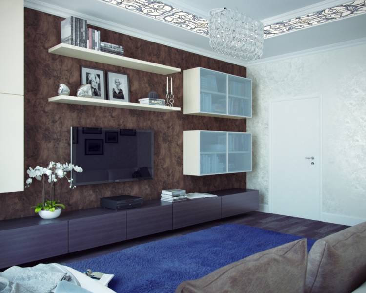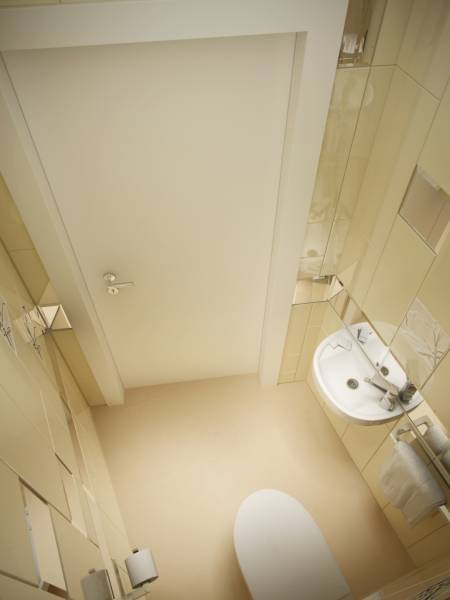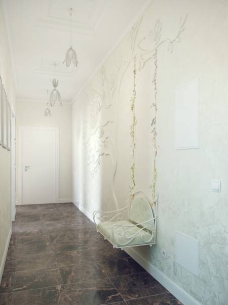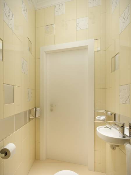 Темно-коричневый теплый пол и белые стены с еле уловимым золотистым перламутром. Яркие голубые акценты, и большое количество фотографий, картин с пейзажами и зарисовками. Мягкие полутона для двух ванных комнат выбраны согласно общей концепции интерьера.