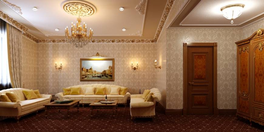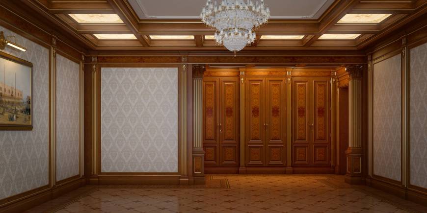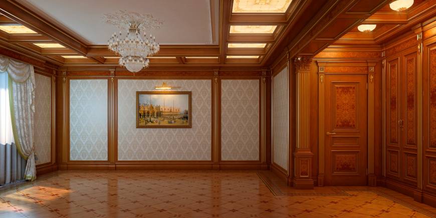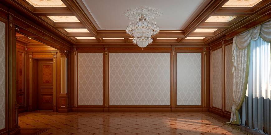 Данный интерьер является ярким примером того, что классика никогда не выходит из моды! Большие открытые пространства возвращают нас в прошлые времена с их любовью к роскоши и изяществу! Темное дерево контрастирует на фоне светлых стен бежевого оттенка, а кесонный потолок и украшающая его люстра создают атмосферу настоящего дворца!