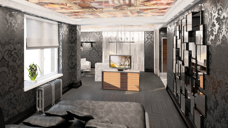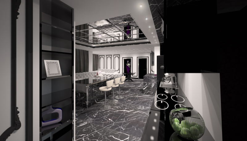 Яркая и динамичная двух-этажная квартира. Особенность этого объекта – контраст во всем. Гармоничное сочетание черного и белого, современности и классики. Большое количество стекла и глянцевых поверхностей, сбалансировано правильным многофункциональным освещением.