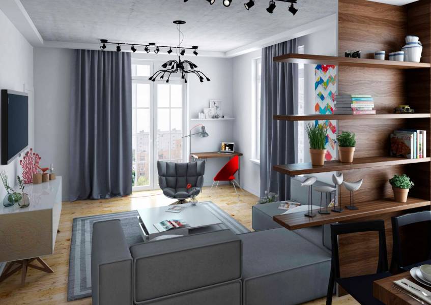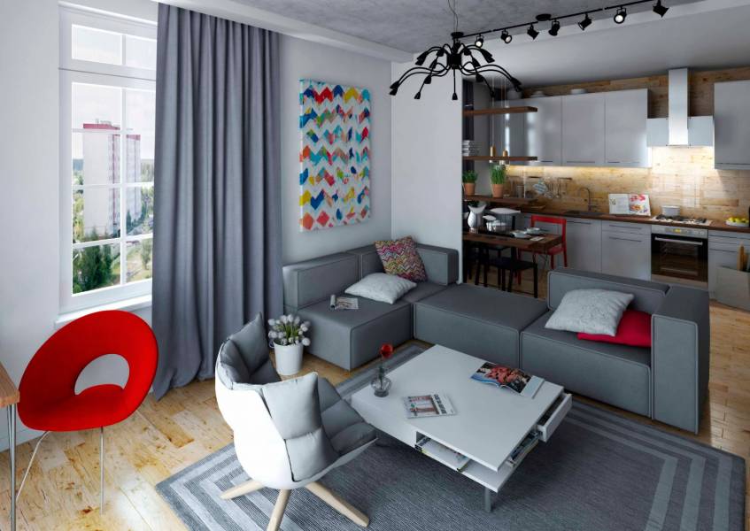 Контраст ярких современных акцентов мебели и декора в соединении с благородными оттенками серого и белого цветов – создают уютную и в то же время творческую атмосферу. В такой квартире хочется заниматься творчеством, отдыхать и просто прекрасно проводить время.