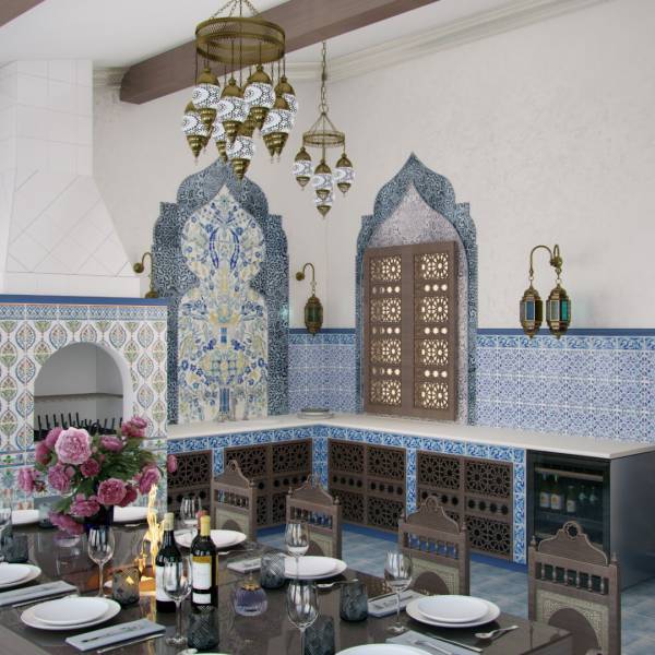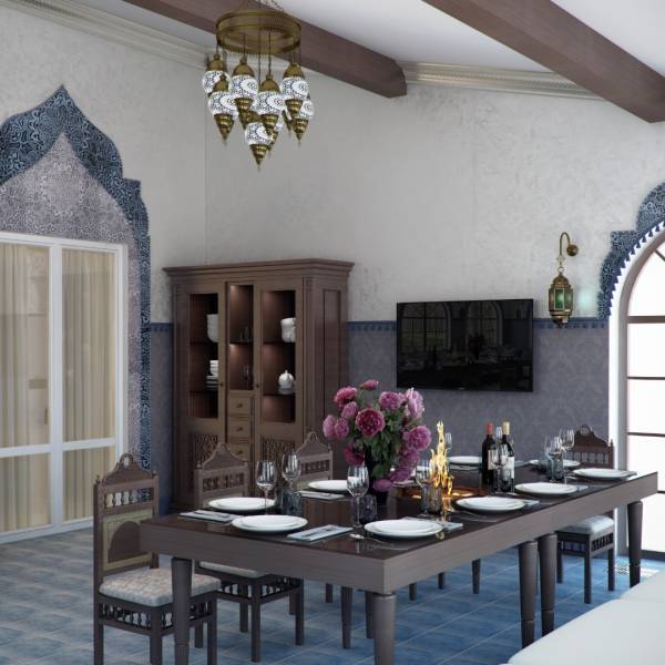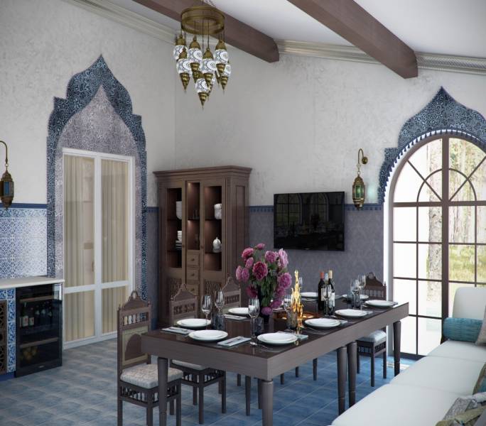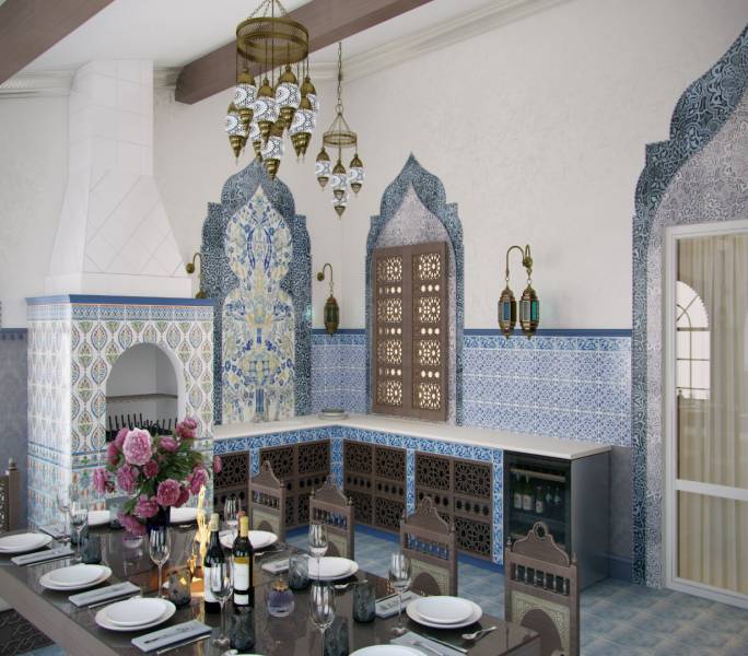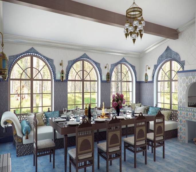Веранда — прекрасное место для комфортного отдыха. Благодаря оригинальному и яркому интерьеру она стала похожа на восточную гостиную.Дизайн помещения дышит экзотикой и загадочностью.Необычайно эффектно смотрится печь, облицованная майоликой с восточными узорами.Восточная веранда оригинально вписывается в дом с европейским интерьером.