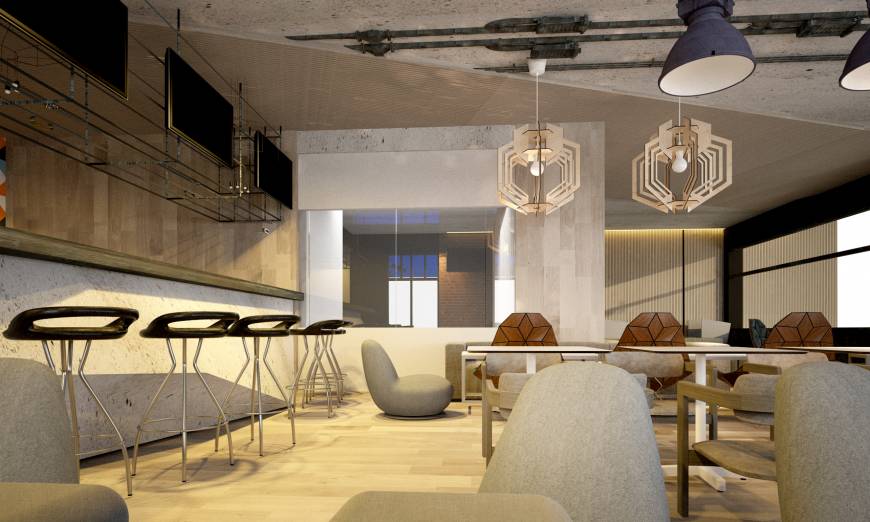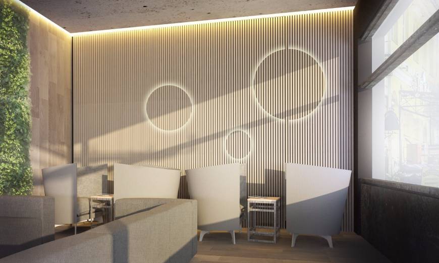 Дизайнеры использовали существующие корпоративные цвета в создании фирменного паттерна. Паттерн интегрировался в интерьер, ассоциируя кафе с уже существующим, популярным брендом. Было решено сделать кафе с использованием элементов стиля лофт, greenwall, фирменного принта на стенах, удобной и оригинальной мебелью.