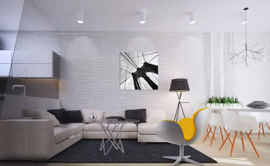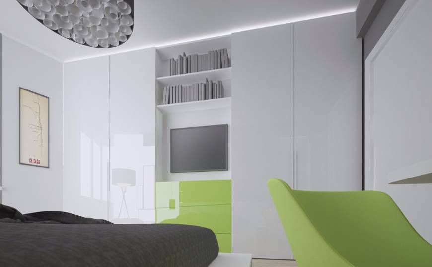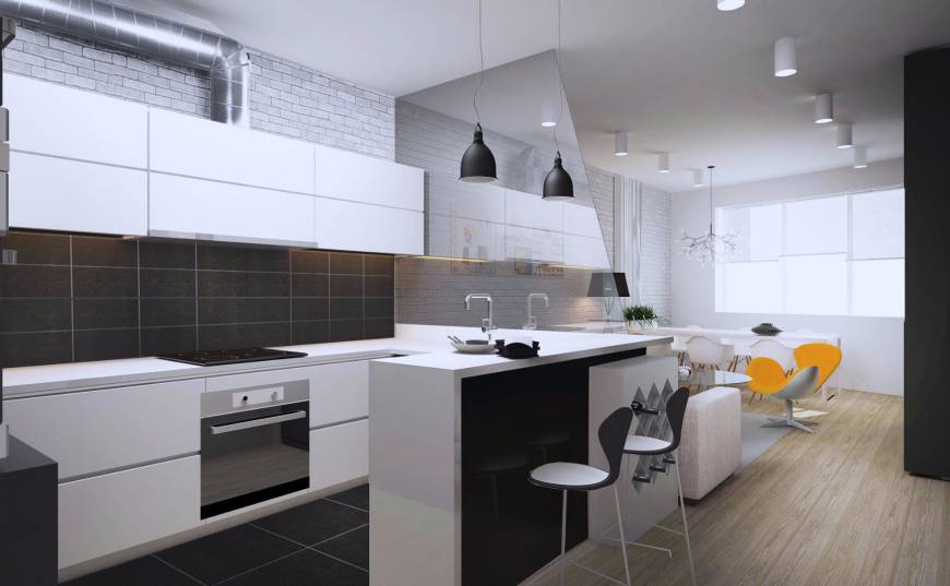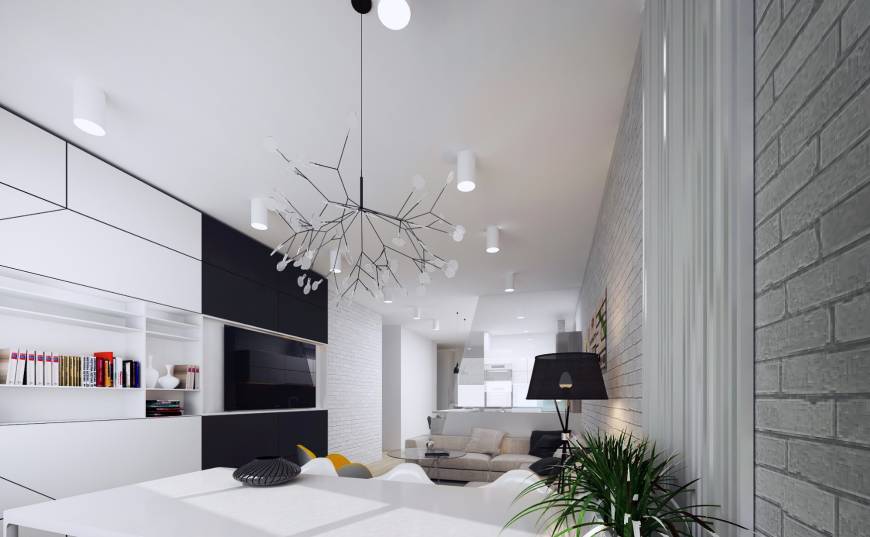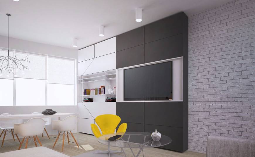 Пространство должно было учесть кухню и зону отдыха в одном помещении, спальню и будущую детскую. Стиль дизайна был выбран в сочетании лофта и минимализма. Ванная комната должна была напоминать ванную из дорогого отеля. Гостевой сан узел было принято решение переделать в кладовую, которая одновременно служит кладовкой, помещением для хранения коляски и не портящихся продуктов.Мебель выполнена из крашеного МДФ, напольное покрытие ламинат Pergo с максимально натуральным цветом под дерево, стены покрашены в серые цвета, а кирпичная стена оказалось изюминкой проекта.
