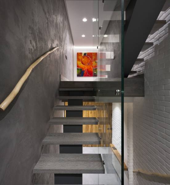 функцию перил исполнили «живые веточки». Межэтажные площадки и ступени