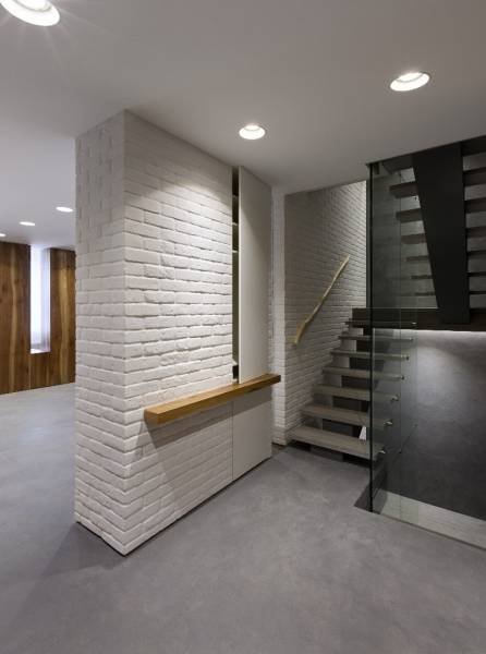 микроцемента и белого кирпича (на 1-м и 3 уровнях на пол положена массивная доска —