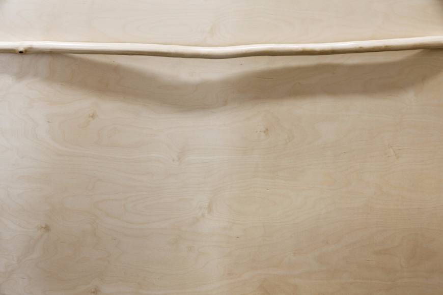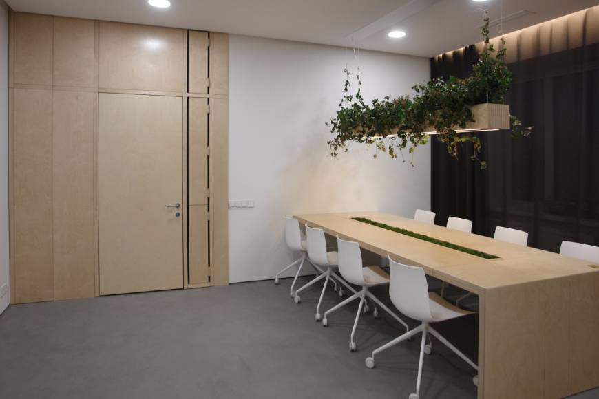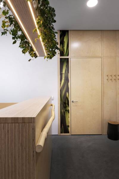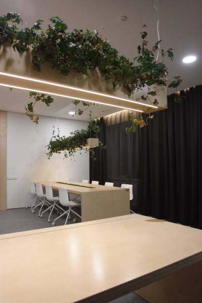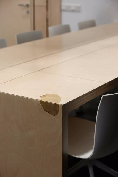 Для изготовления мебели в этом проекте вместо привычного для мастерской массива дерева была использована фанера – более функциональный и экономичный материал. Авторские вещи из фанеры подчеркнуто лаконичны, однако все они обладают небольшими, но заметными нюансами, которые возможны только при индивидуальном подходе к созданию серии. Так, каждый рабочий стол украшен интарсией. Длинный стол для переговоров в центре имеет углубление для поддонов с растениями, которое при желании можно спрятать под крышкой, сделав рабочую поверхность идеально гладкой. Стойка ресепшна дополнена натуральным природным элементом. А экономичные светодиодные светильники над столами представляют собой любопытный конгломерат с кашпо.