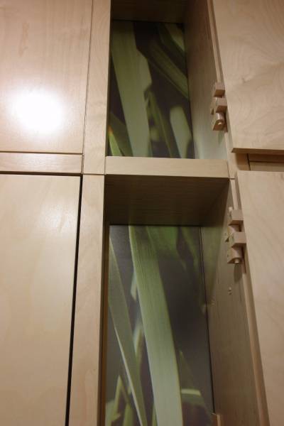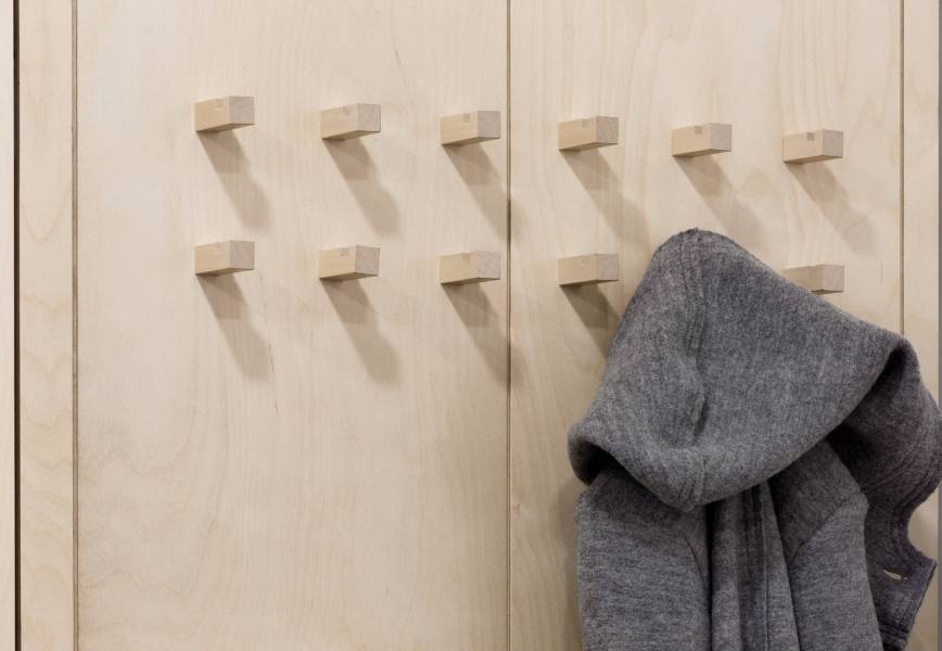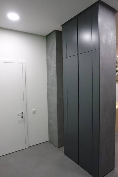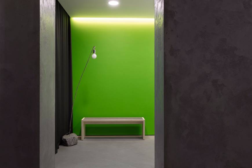 Офис состоит из нескольких функциональных зон – приемной, переговорной, кабинета, зоны отдыха – организованных как комфортное свободно перетекающее пространство. На минимальной площади разместили рабочие места для двух человек и необходимую оргтехнику, а также кофе-машину. Чтобы оборудование не привносило визуальный «шум» в лаконичное решение интерьера, его спрятали за большим стеклом, украшенным принтом. Бетонный пилон, разделяющий рабочую комнату и зону отдыха, вмещает небольшой скрытый гардероб для сотрудников. Здесь есть и открытый гардероб для посетителей, решенный в лучших традициях экологического дизайна – просто, декоративно и функционально.