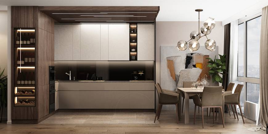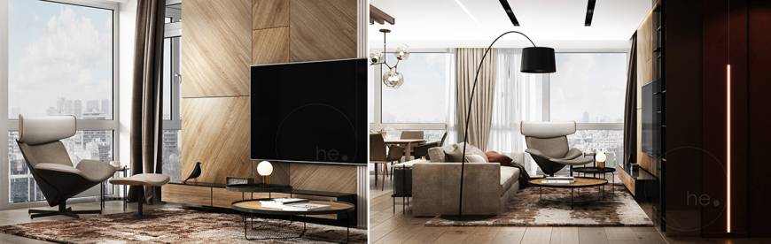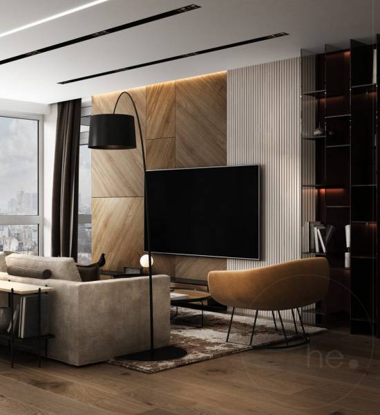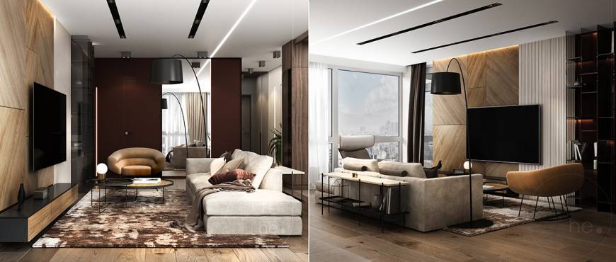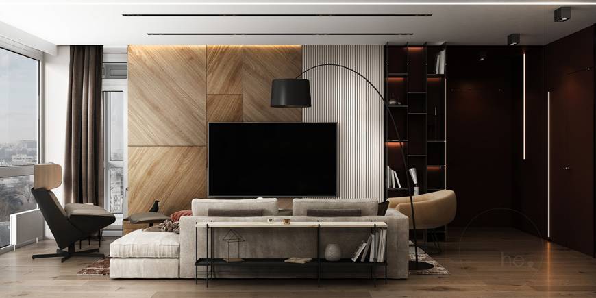 семьи из 3 человек. Квартира находится в центре Киева, в жилом комплексе Hoffmann Haus. Изюминкой гостиной является декоративная деревянная панель в сочетании с контрастным цветом бургунди. Кухня разработана в пастельных бежевых тонах в сочетании с темным деревом. Акцентным пятном данной зоны является картина. Тканевая панель у изголовья кровати добавляет уюта спальной зоне.