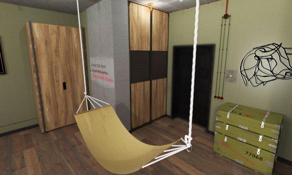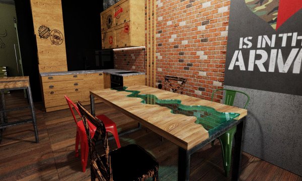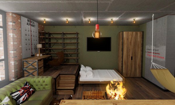 Інтер’єр квартири створювався на замовлення чоловіка, який працював військовим лікарем, під час служби він побував у декількох країнах сходу. Зараз він працює перекладачем і багато де подорожував. Його дружина теж військовий лікар. Також в нього є дві дочки студентки, одна з яких вивчає японську. Квартира планувалась не для постійного проживання, тому, що основне житло знаходилось за містом. Тож ця квартира стала експериментом, як для замовника так і для дизайнера. Інтер’єр наповнився деталями в стилі мілітарі. Військовий ящик, перетворили на комод. В центрі квартири з’явився гамак та вогнище. Стіни прикрасили графіті з лікарською тематикою. А кухня стало закордонним паспортом, на фасадах якої були печаті країн де побували власники. Символічними стали і кольори зелений, що часто використовується в камуфляжі та червоний — символ життя. Навіть деякі дроти зовнішньої проводки червоного кольору, що символізують артерії. Всі меблі виконані в стилі лофт. Поєднання дерева та металу. В подіумі сховано ліжко, а диван що стоїть по центру розкладається, тож при необхідності вся родина може залишитись на ніч, у квартирі. Стіл та умивальник нагадують про безкраї ріки та широкі каньйони.