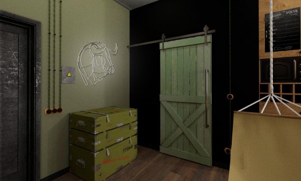Панно бик (авторська робота дизайнера) символізує рік народження власника квартири та підкреслю його найкращі риси, працелюбство, мужність і доблесть.