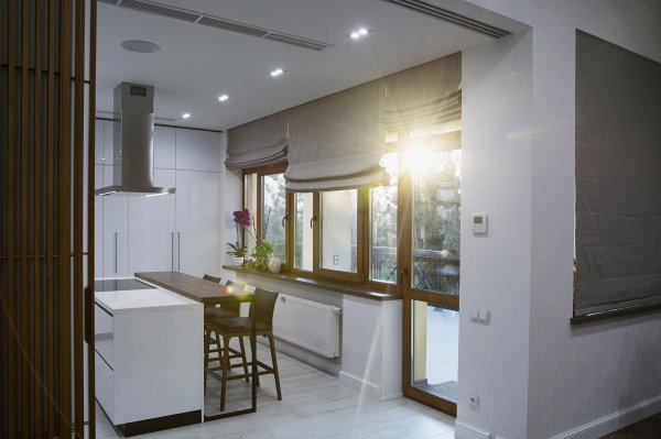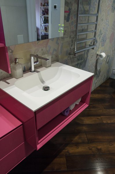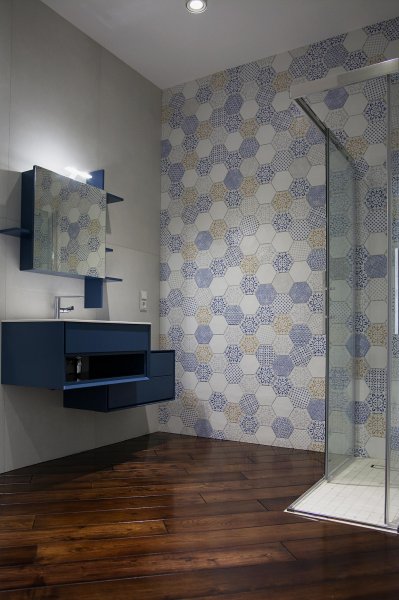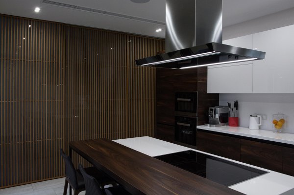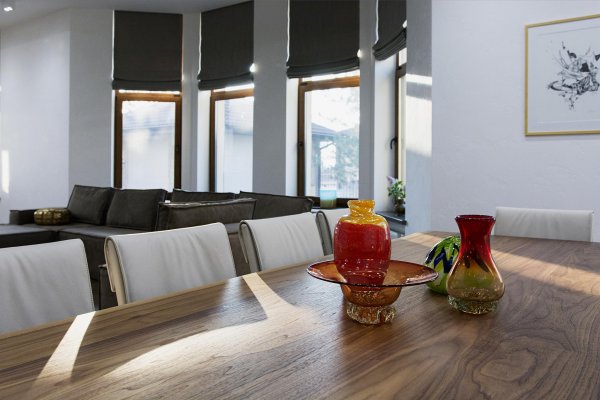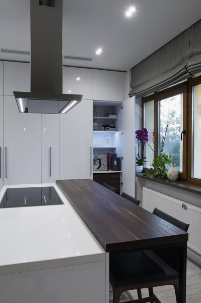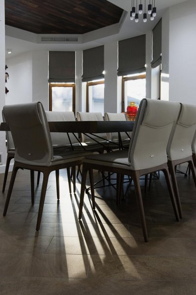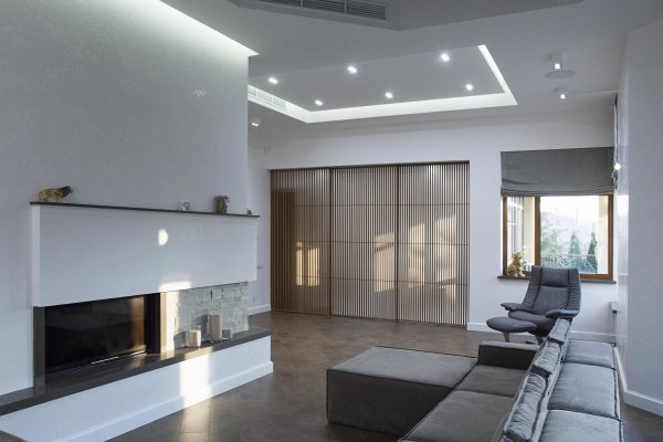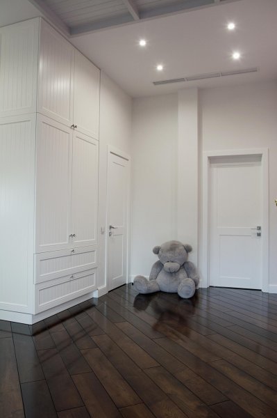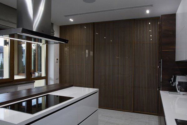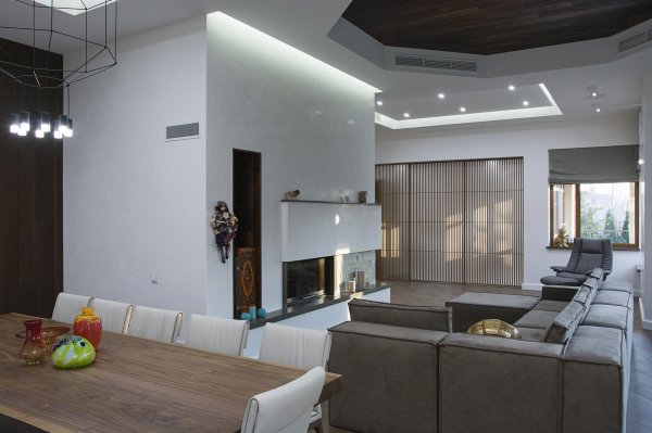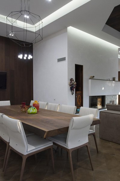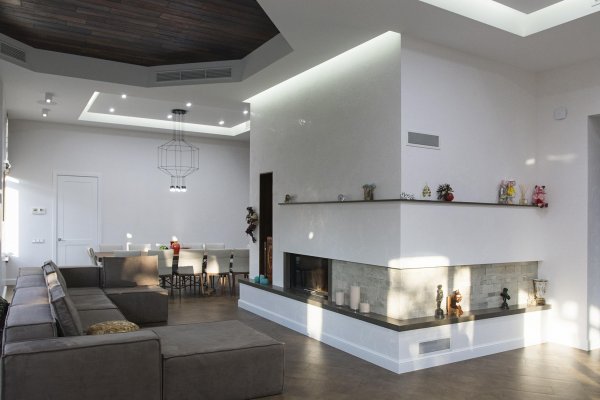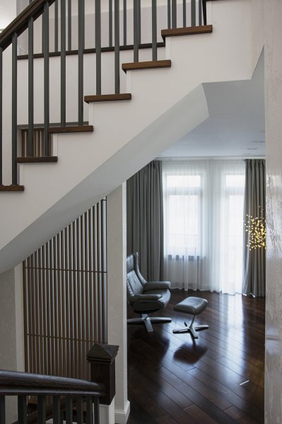 Очень душевный загородный дом, дизайн которого был подготовлен на одном дыхании. Атмосфера тут теплая и семейная. Стены покрыты декоративной штукатуркой, первый этаж — керамогранит на полу, второй и лестница — акация под маслом, мансарда — ясень под маслом. Некоторые стены так же декорированы натуральным деревом акации. Эркер в гостиной задал тематику гексагона, которая повторилась в форме декора потолка и в отделке других помещений. Керамогранит в санузлах — Италия и Испания. Сантехника — Италия, Испания, Германия. Мебель производства Украины, Италии. Общая стилистика дома — современная, с этническими элементами.