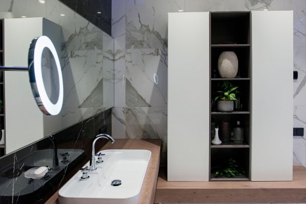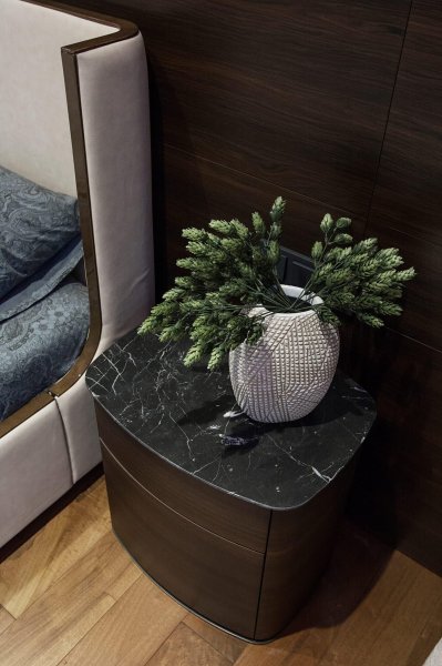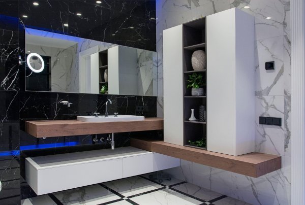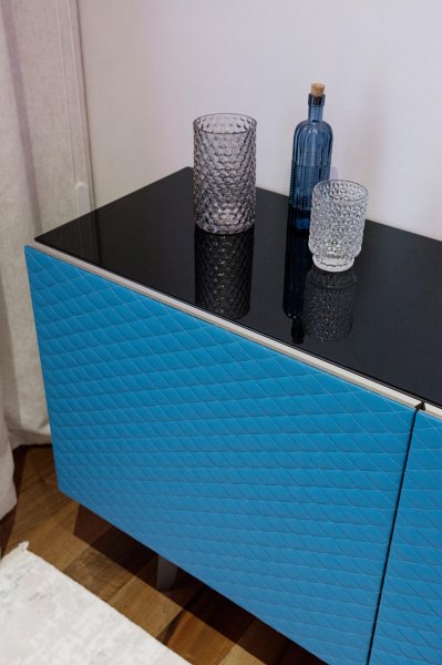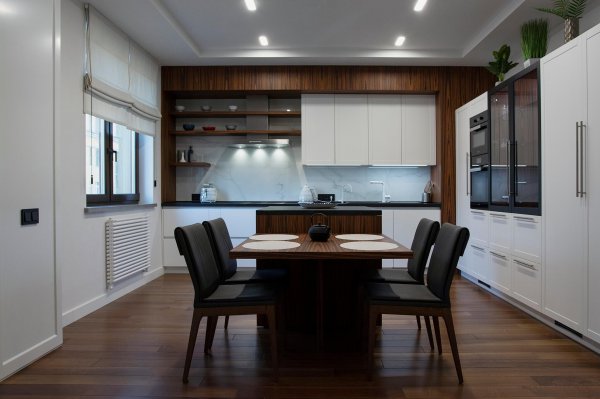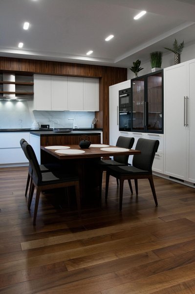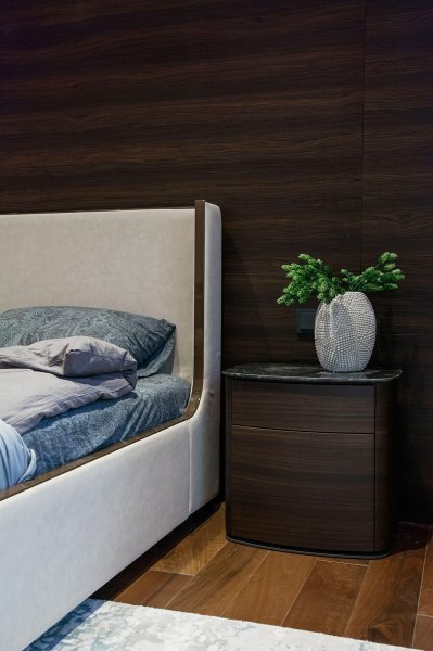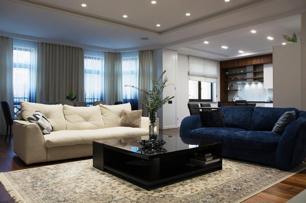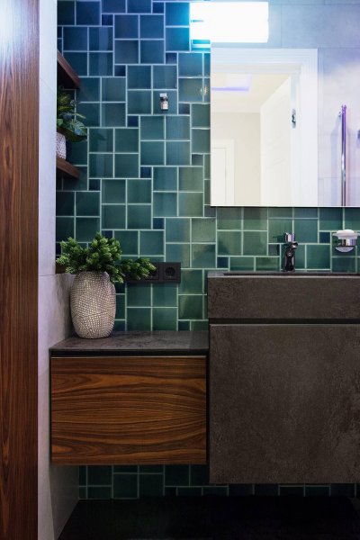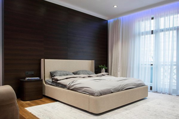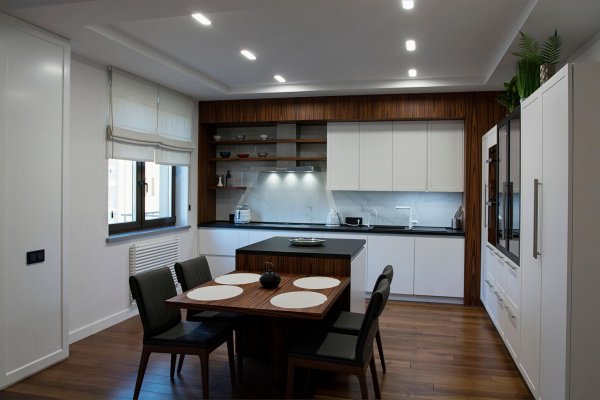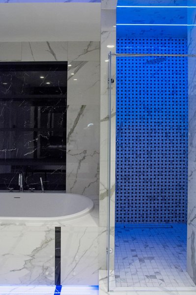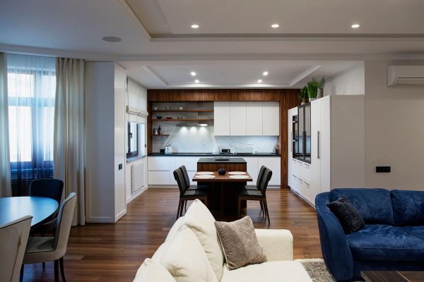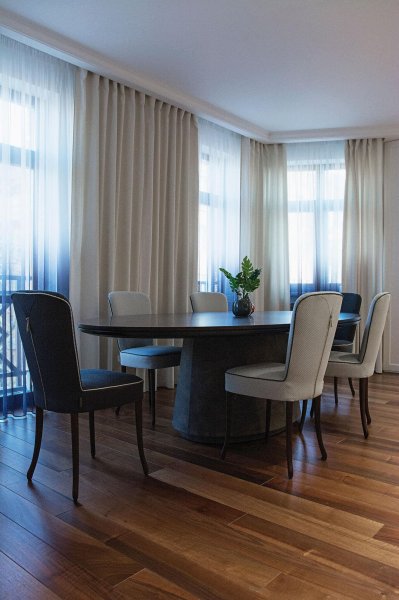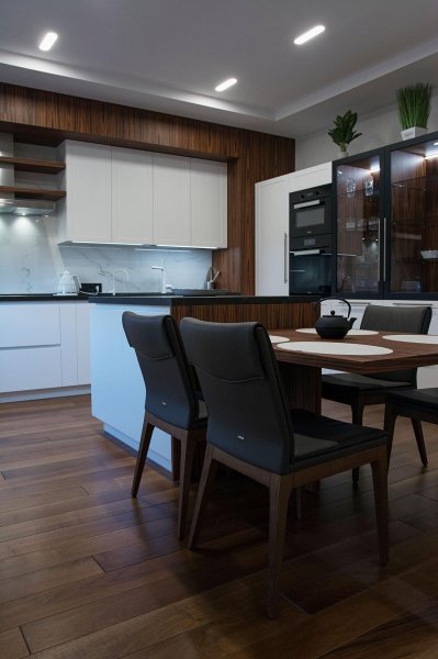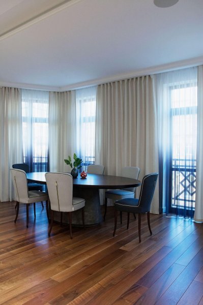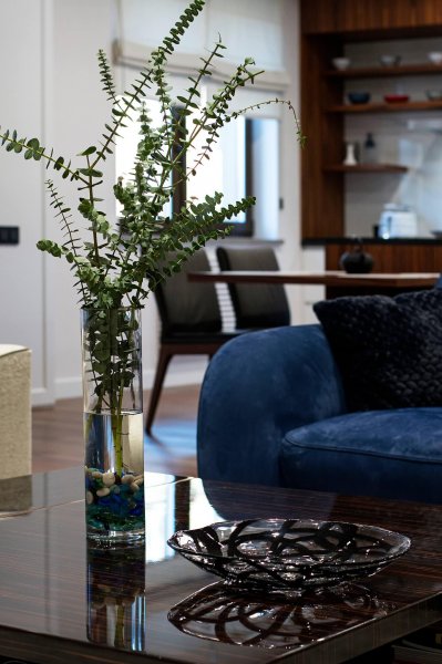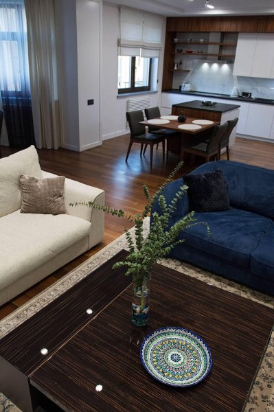 Стильная, но одновременно уютная и комфортная квартира. Во время реализации было много новых идей, рисовался проект с большим творческим интересом и вдохновением. Тут использовалось много моих любимых элементов — бирюзовая плитка в гостевом санузле с крекелюрованной поверхностью, текстуры мрамора и экзотического шпона палисандр, элементы кожи, нубука, панели с филенками крашенные и панели шпонированные, тяжелые шторы из грубой ткани, градиентные растяжки, многоуровневое освещение, потолочные карнизы. Стены оформлены декоративной штукатуркой с мягкой фактурой, с небольшим рельефом, почти весь пол покрыт паркетной доской из североамериканского ореха под маслом. Керамогранит в санузлах — Италия и Испания. Сантехника — Италия, Испания, Германия. Мебель производства Украины, Италии. Общая стилистика квартиры — современная с использованием классических элементов (филенки, карнизы), а так же с этническим декором.