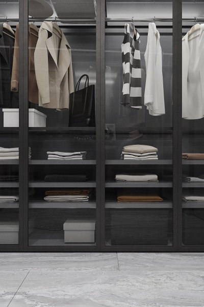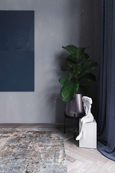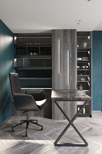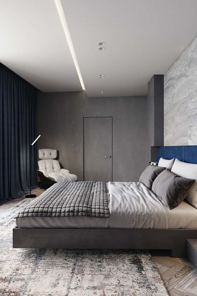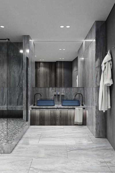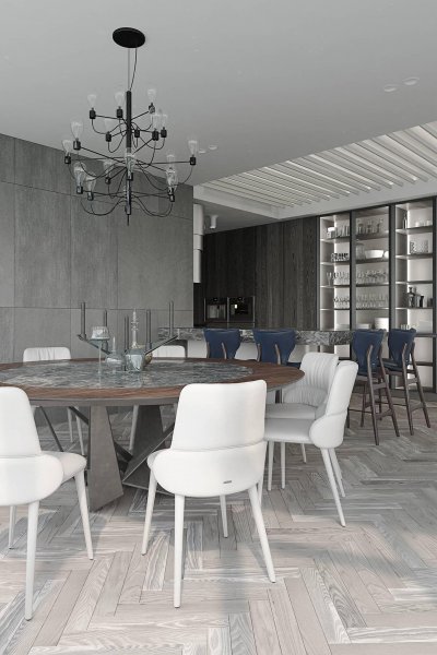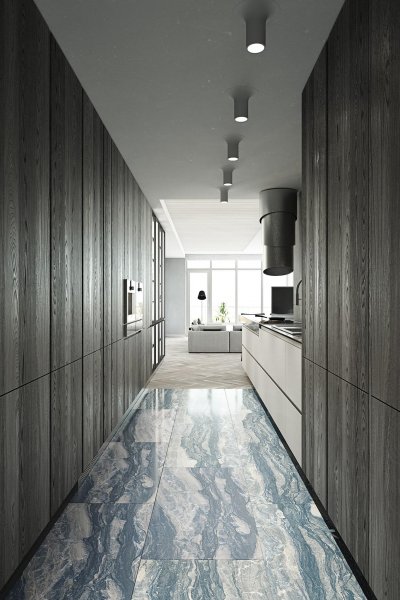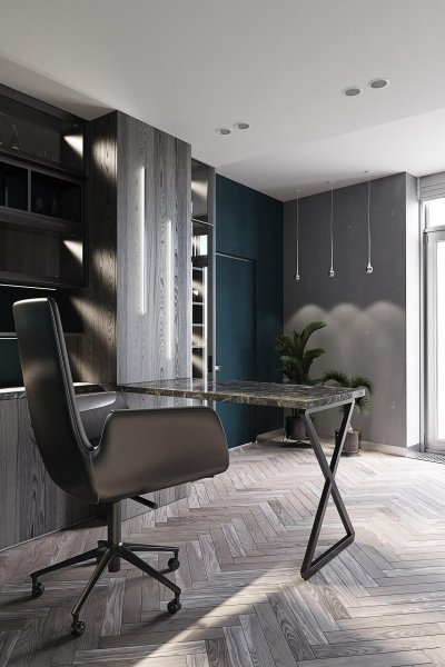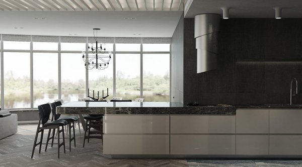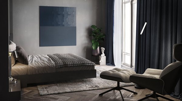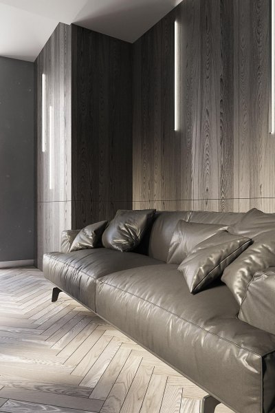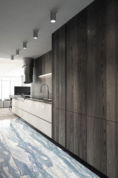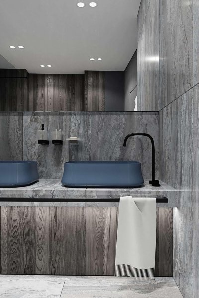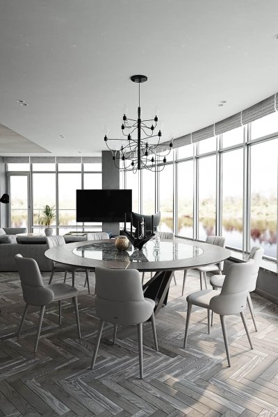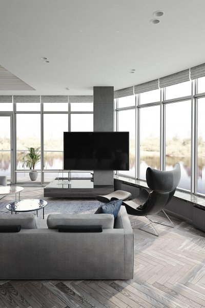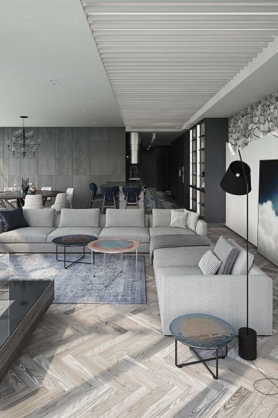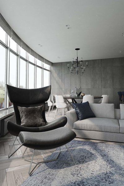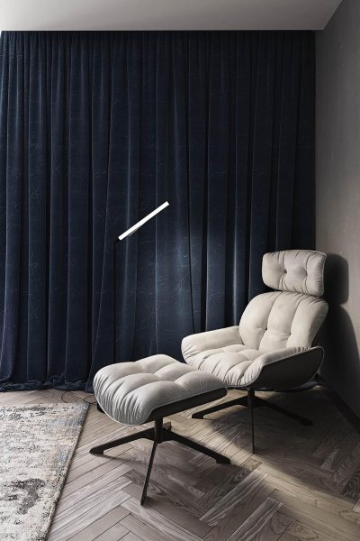 Квартира находится в шикарном доме на берегу Днепра. Большая площадь, очень нестандартная форма плана, сложный проект, который захватывает. Центральное место квартиры — гостиная с большими панорамными окнами с видом на яхт-клуб. Спальня, кабинет, гардероб, большой хозяйский санузел, удобный гостевой — все необходимое присутствует. Когда я впервые попала в квартиру, я долго изучала пространство. Вид за окном в гостиной строго заявляет, что дизайн помещения должен не отвлекать от созидания. Поэтому, в качестве основного цвета был выбран спокойный и уравновешенный серый. А в дополнение ему — оттенки синего, где-то он напоминает Днепр. Керамогранит в санузлах — Италия и Испания. Сантехника — Италия, Испания, Германия. Мебель производства Украины, Италии. Общая стилистика квартиры — современная.