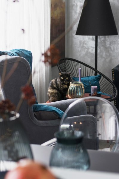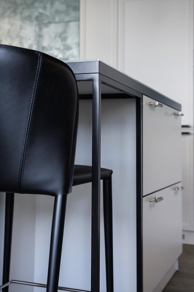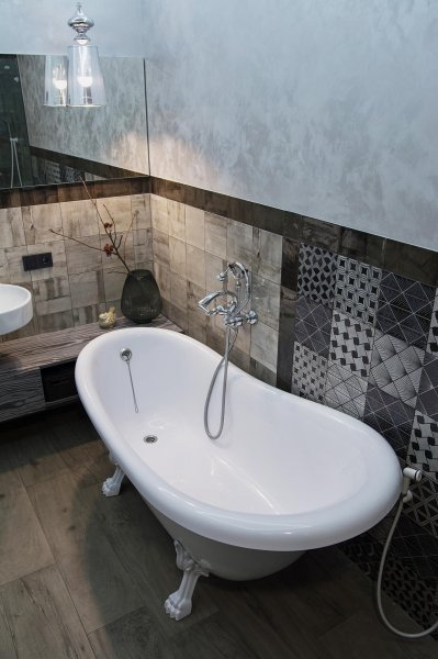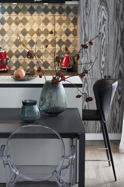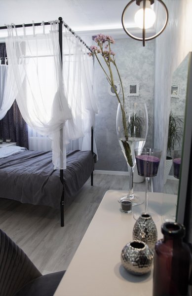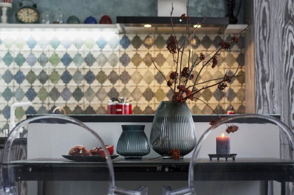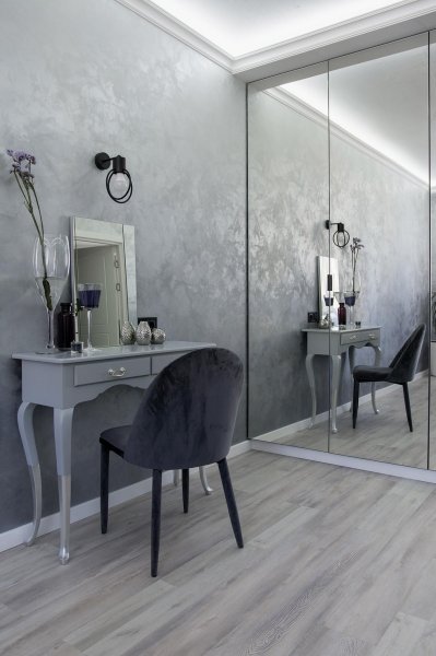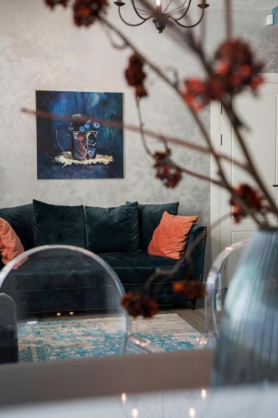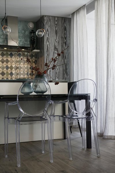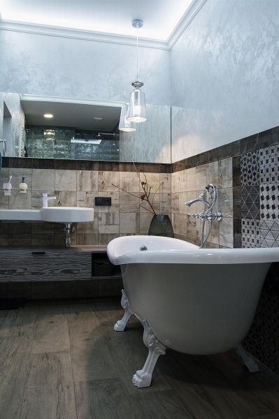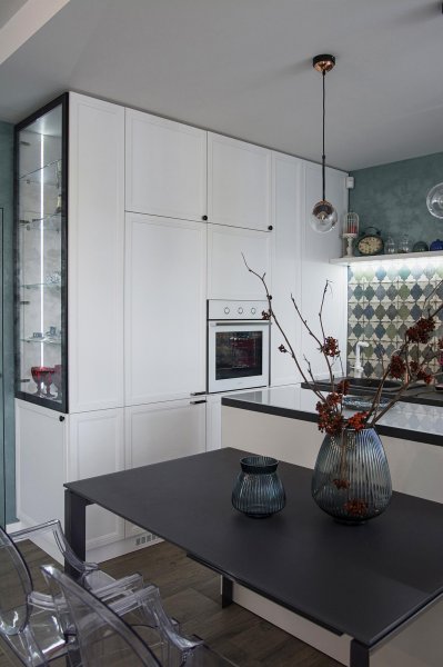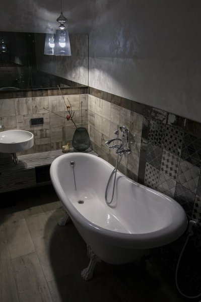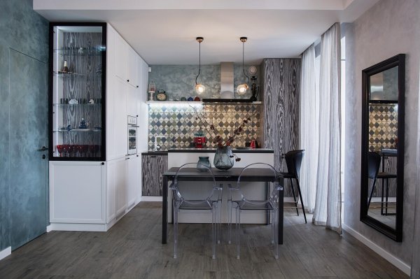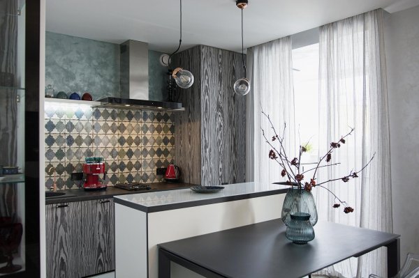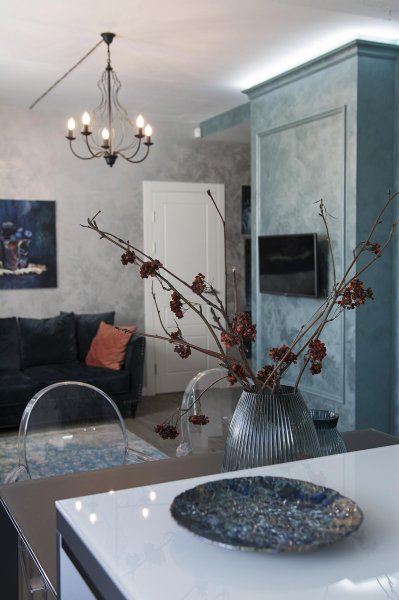 Эта квартира — творческое, экспериментальное пространство. Во время реализации было очень много импровизации, большое количество разных «хочу» в рамках выбора цветов и мебели. А вот разводка электрики и сантехники выполнялась по очень строгому плану. Стены тут тоже в декоративной штукатурке, как и во многих других моих проектах. Тут она особая, будто бархатно-метализированная, это странное сочетание, но описание такое потому, что материал будто не стабилен. Он мерцает строго и, одновременно, мягко. Не бывает одинаковым. Он меняется в зависимости от времени суток, освещения, погоды. И это важно для этой квартиры, переменчивое настроение дизайна никогда не надоедает. Тут все выстроено на резких контрастах — плиты потолка без отделки, а только в покраске, в контрасте с идеально гладкими стенами. Велюровый диван и шторы из льна. Классическая ванная и современный умывальник. На полу — керамогранит. Плитка в ванной — Испания. Сантехника — Италия. Мебель производства Украины. Общая стилистика квартиры — современная с использованием классических элементов (карнизы, классическая ванная), а так же с этническими элементами, которые особенно хорошо читаются в плитке на рабочей поверхности, там присутствует марокканский четырехлистник.