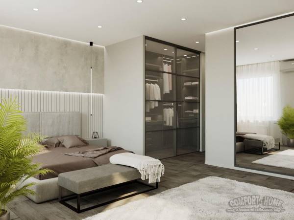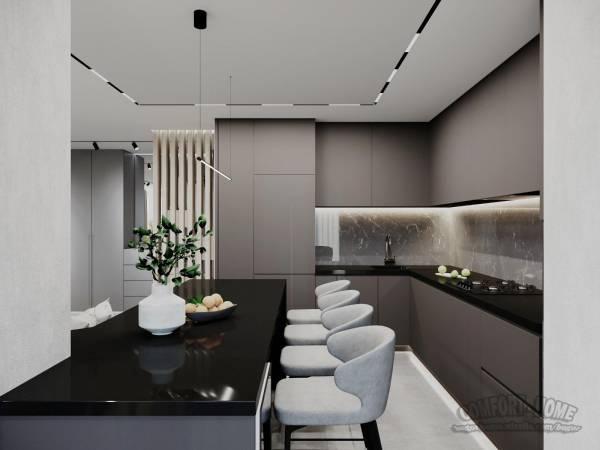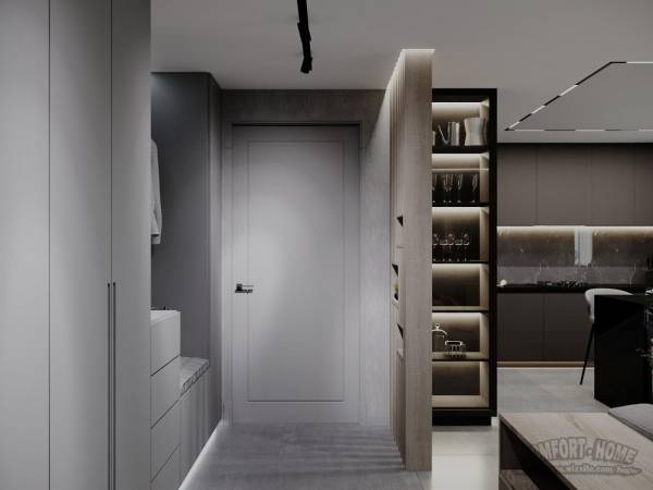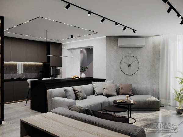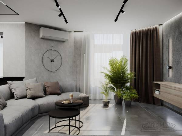 Дизайн квартиры был выполнен в новом монолитно-каркасном доме с перепланировкой помещений. Интерьер был создан в Современном стиле с элементами Лофта. Наличие некоторых конструктивных элементов самого дома, сыграли большую роль в виде декора. Элементы мебели в виде дерева и наличие самого дерева придают интерьеру изысканности и теплоты. Серые оттенки с перемешиванием других цветов, придают спокойствия и баланса. Заказчики очень остались довольны своим проектом, и этому подтверждение их отзывов: