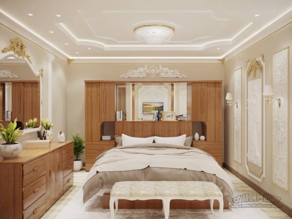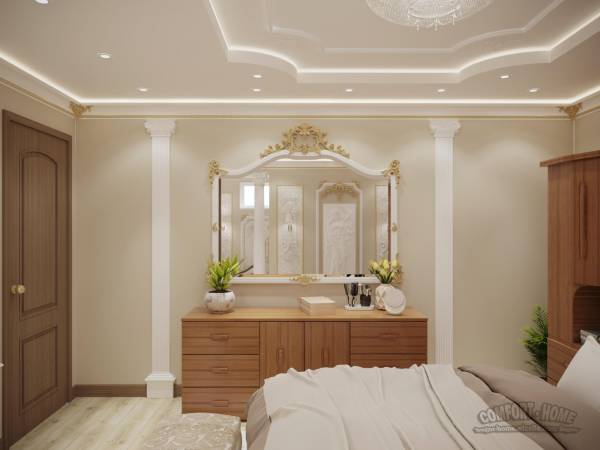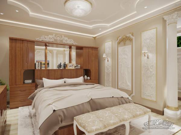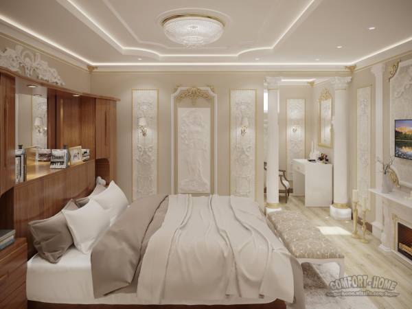 Следующий проект был разработан в классическом стиле для очередного моего заказчика из Канады. Мебель изготовленную из натурального дерева заказчик предпочёл оставить и пришлось весь проект разрабатывать исходя с поставленной задачи. Заказчик данного дизайн проекта, не взирая на своё возраст, очень жизнерадостный и творческий человек, рисует, занимается вышиванием, лепит скульптуры и декоративные изделия из цементной смеси, формулу которой сам и придумал, как он сказал. Для своей спальни заказчик предпочёл сам изготавливать декор и лепнину. В интерьере используется декор который хозяин спальни сам захотел изготовить и осуществить свою мечту украсив свою спальню лепным декором. Я желаю Этому Большому человеку крепкого здоровья, творческих успехов и реализации всех задуманных планов.