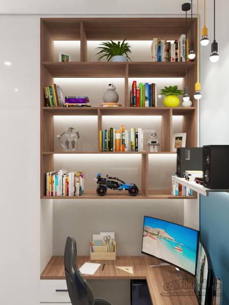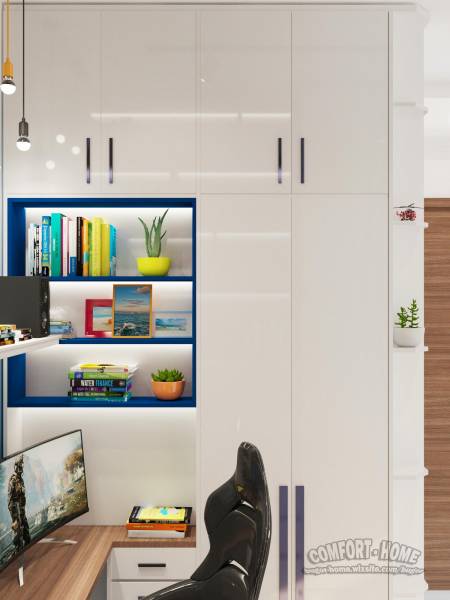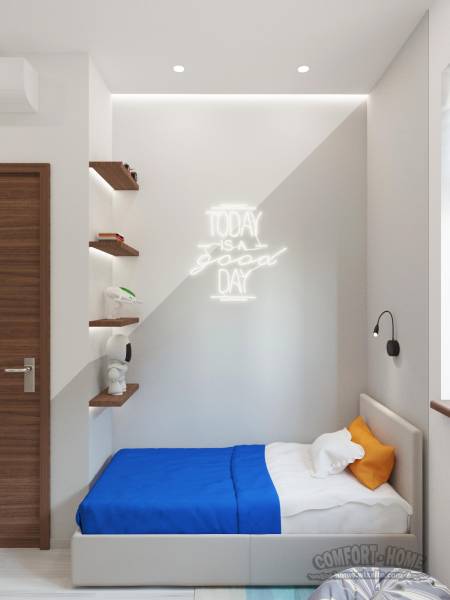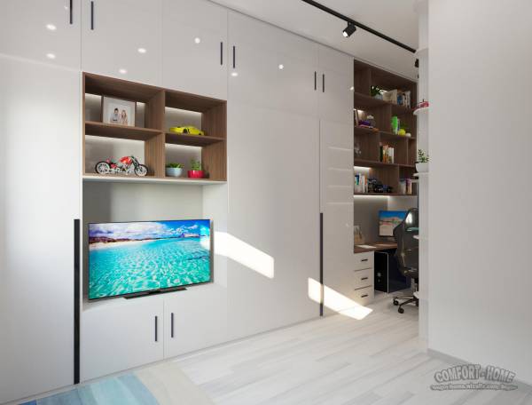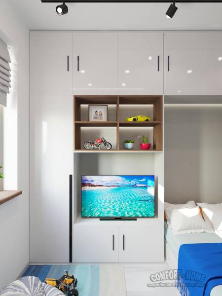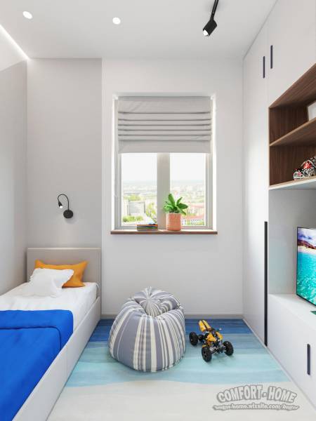 Дизайн проект интерьера Подростковой комнаты был выполнен для молодого и перспективного парня. Мой заказчик очень любит компьютерные игры и даже участвует в чемпионатах. Он хотел чтоб в комнате было много мест хранения. Большой стол, где можно разместить два монитора и много полочек для будущих наград. Ещё нравиться темно-синий цвет мебели. Комната не очень большая, но нам удалось выполнить все пожелания нашего заказчика, получилась очень вместительная и функциональная комната.