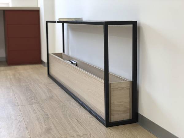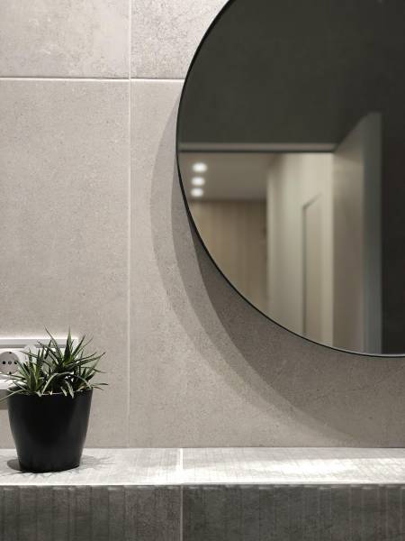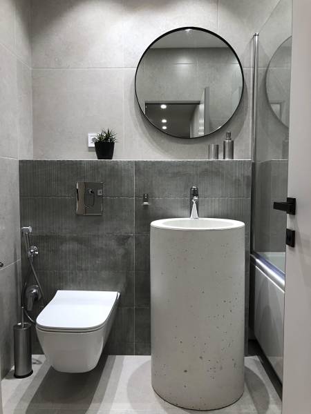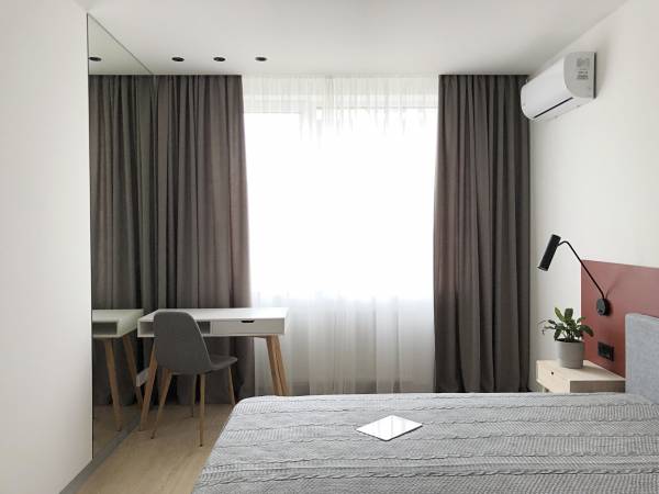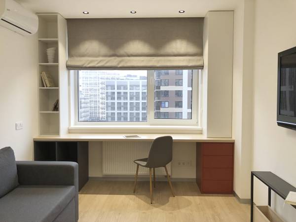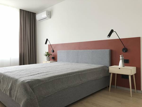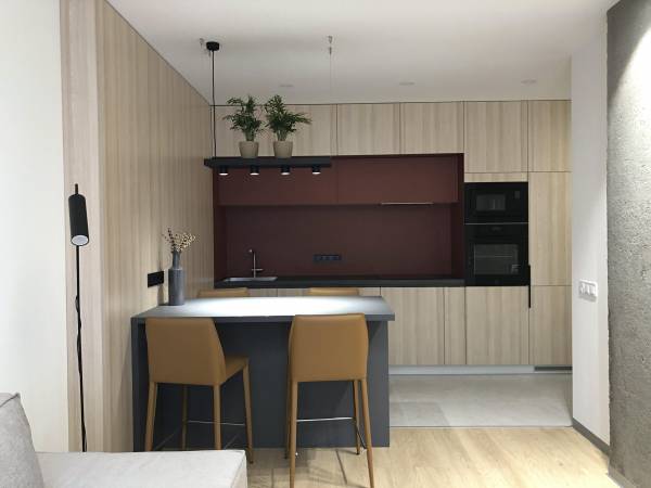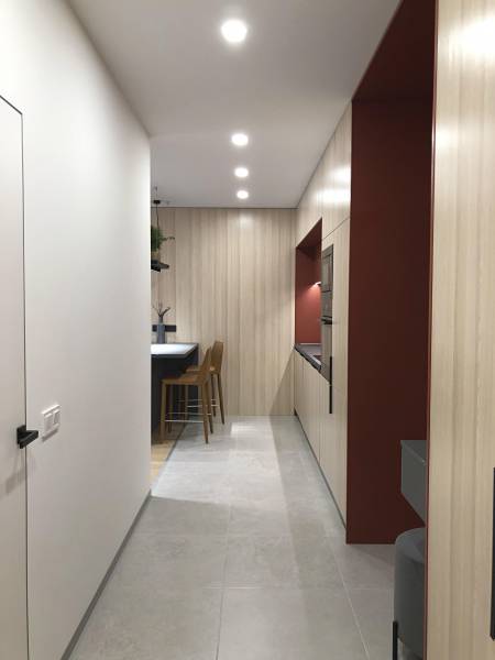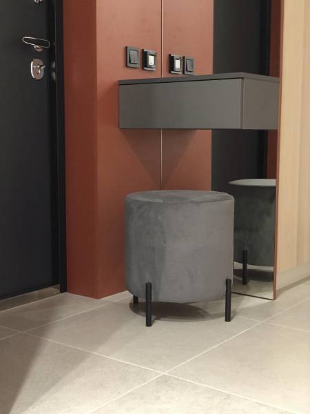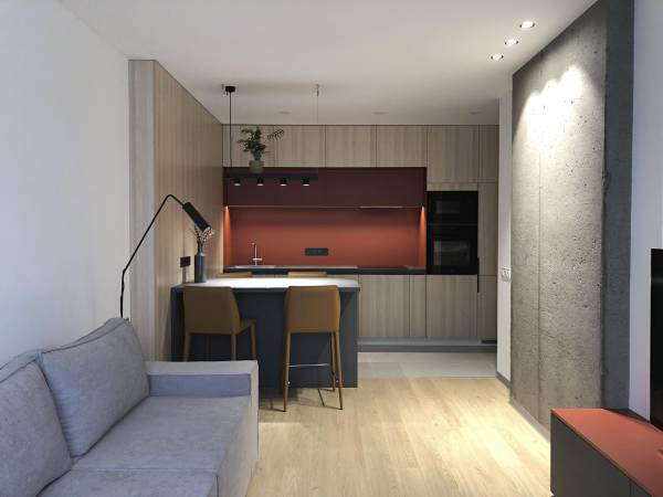 Акцентный цвет - терракотовый - дополнили деревом и бетоном. Яркая и современная под стать стремительно развивающемуся жилому комплексу и его молодым и перспективных жильцов.