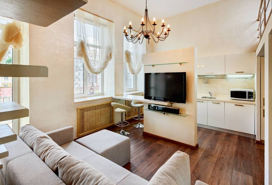 гостиная, кухня, спальня, ванная